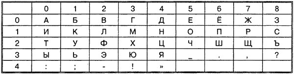 Для начала необходимо разбить текст по две цифры. В каждой паре цифр: первая цифра - номер строки в таблице, вторая цифра - номер столбца в таблице. По данным координатам находим букву в таблице и записываем. В итоге получаем зашифрованное слово. Ответ, получившийся у меня, прилагаю на фотографии. Т.к. получился набор букв (но созвучно выражению "ЧТО? ГДЕ? КОГДА?") предположу, что в условиях задачи есть ошибка. Или, возможно, зашифрован бессмысленный набор букв.
