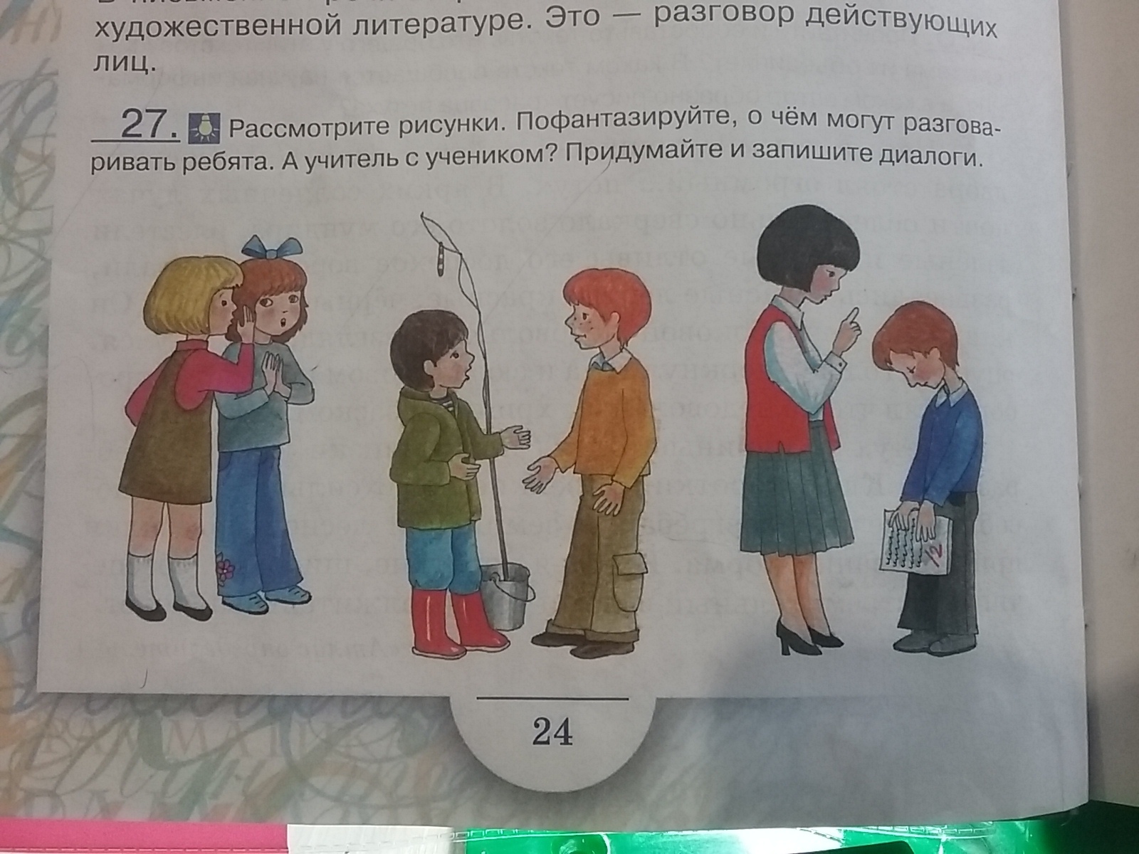 Рассмотрите рисунок. Пофантазируйте, о чем могут разговаривать ребята. Придумай и запишите диалоги.