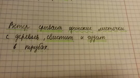 Cинтаксический разбор предложения.Ветер срывает одинокие листочки с деревьев свистит и гудит в трубах