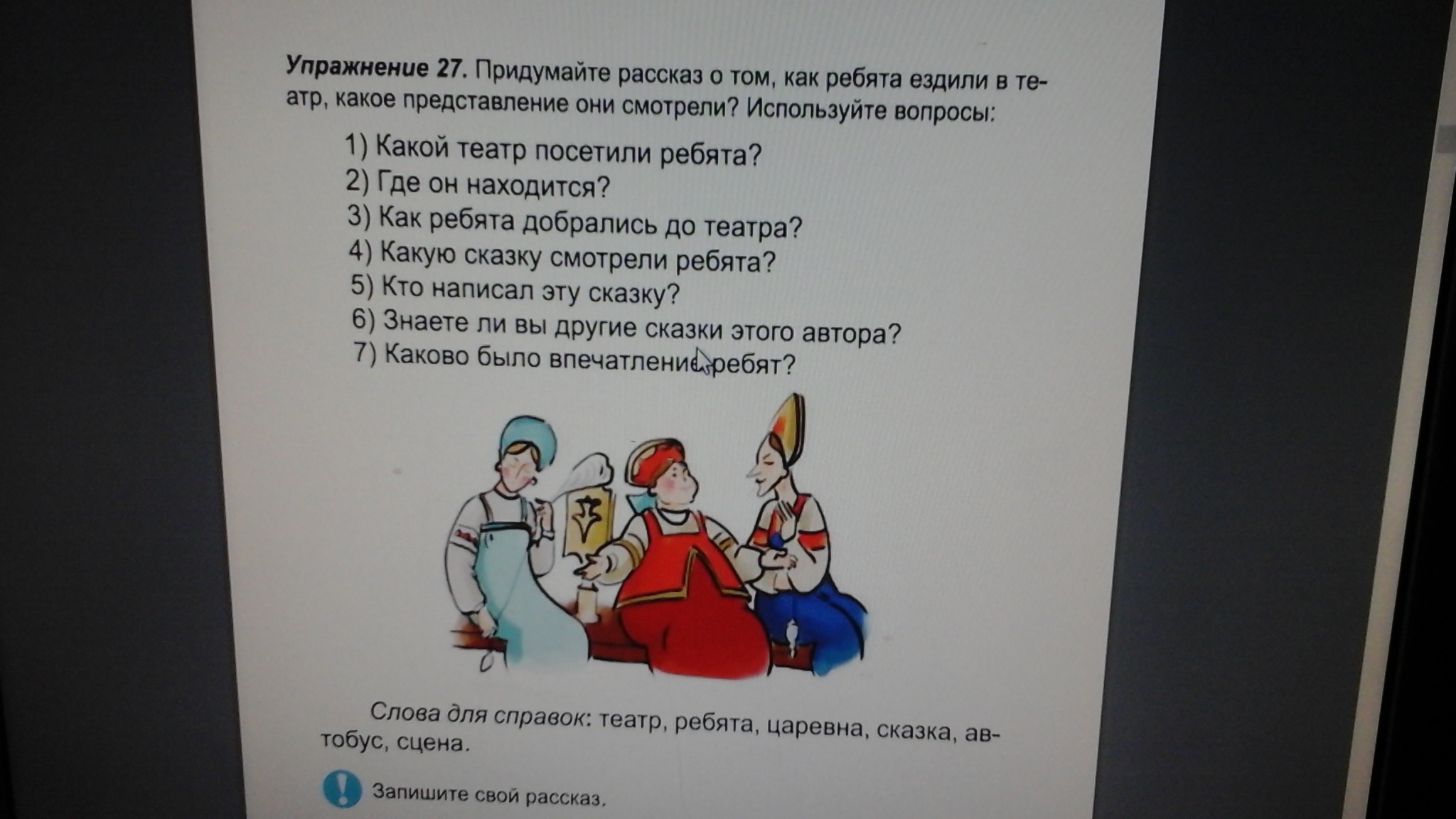 Сегодня ребята ездили в казахский музыкально-драматический театр им. Ж. Аймаутова. Он находится на улице Ломова. Ребята ехали на автобусе. Они смотрели сказку Царевна-Лягушка. Написал ее Афанасьев Александр Николаевич. Нет, я не знаю этого автора. Ребятам ве очень понравилось.