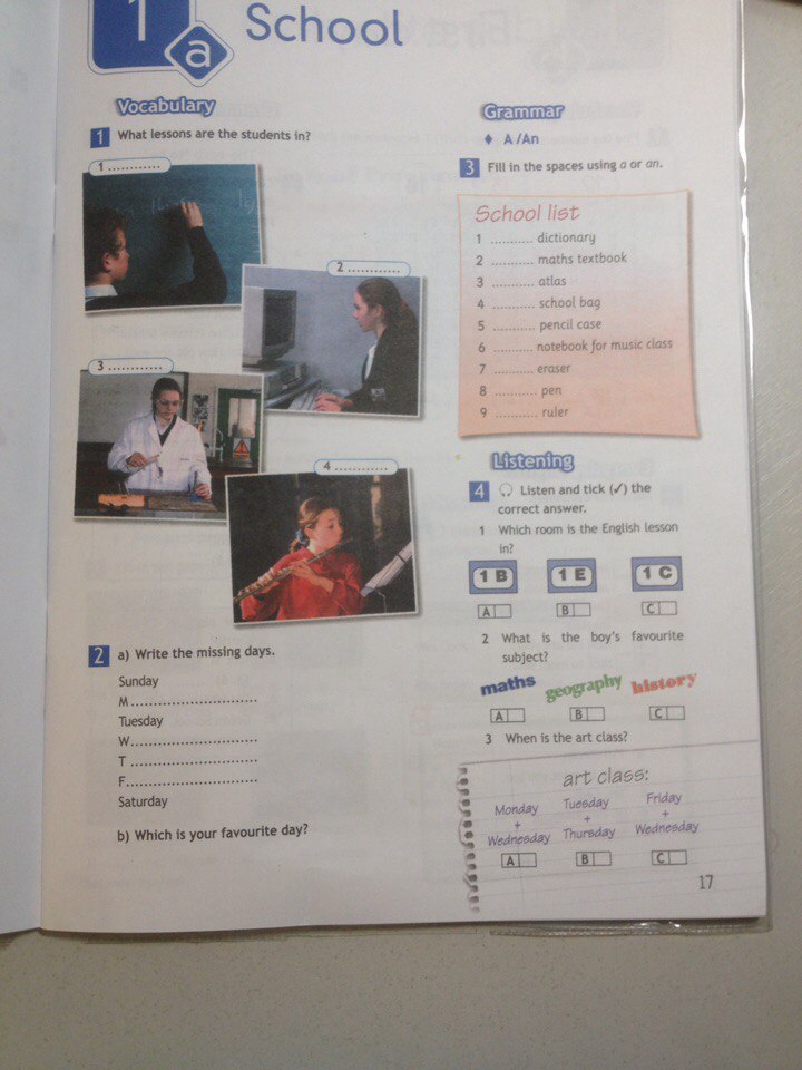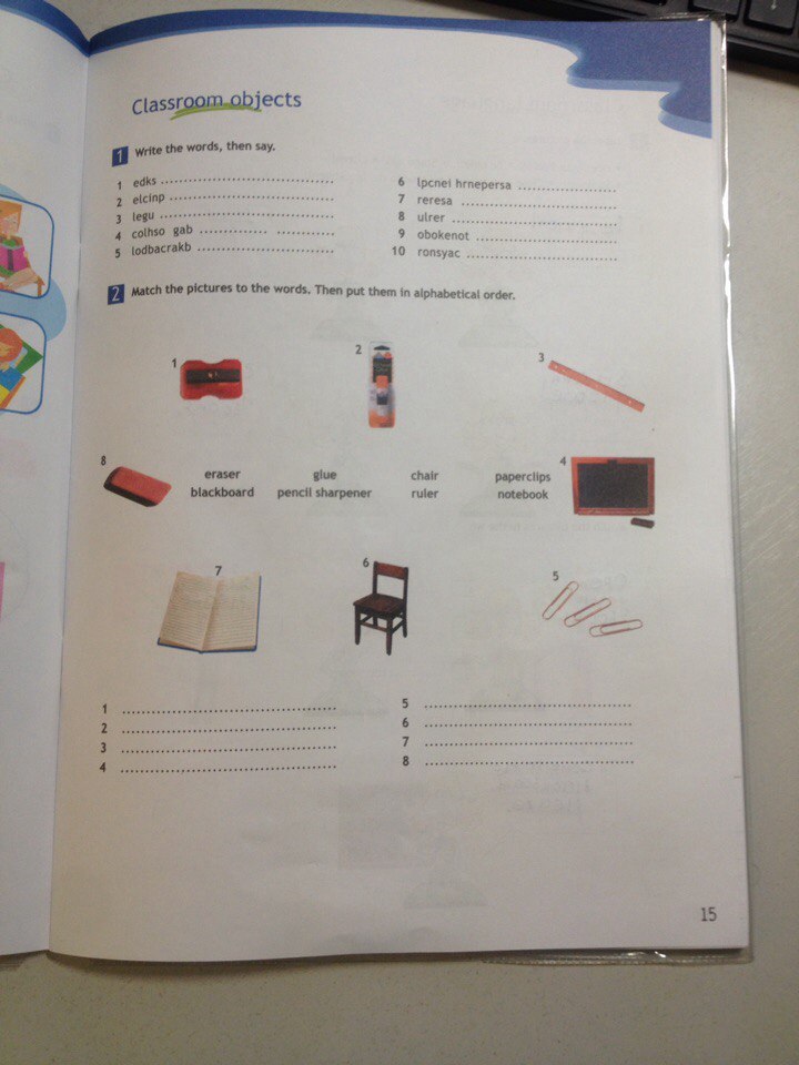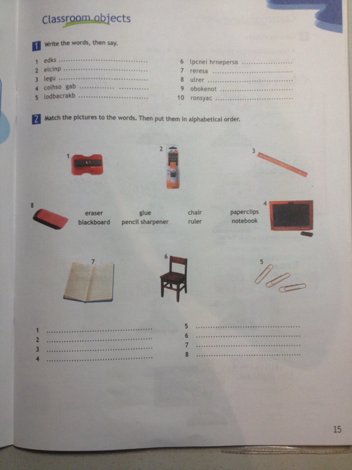 1. desk 3. glue 4. school bag 6. pencil sharpener 7. eraser 8. ruler 9. notebook. Я помогла чем смогла