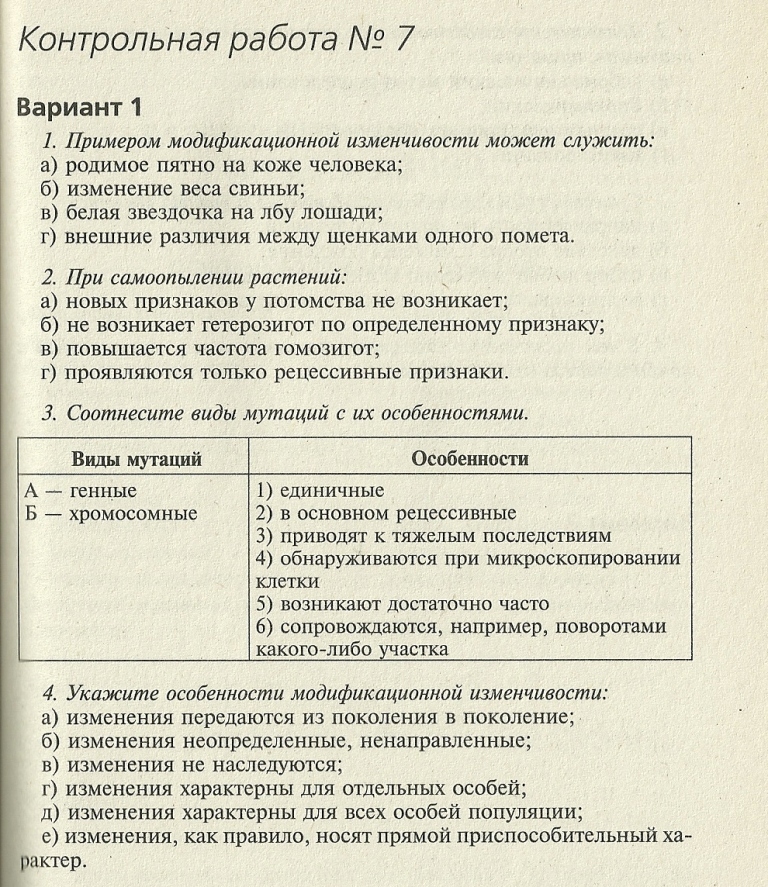 Согласна со всеми предыдущими ответами, кроме 4- вместо Г-это характерно для мутационной изменчивости, должна быть Д- так как это модификационная изменчивость, среда влияет на внешние признаки.