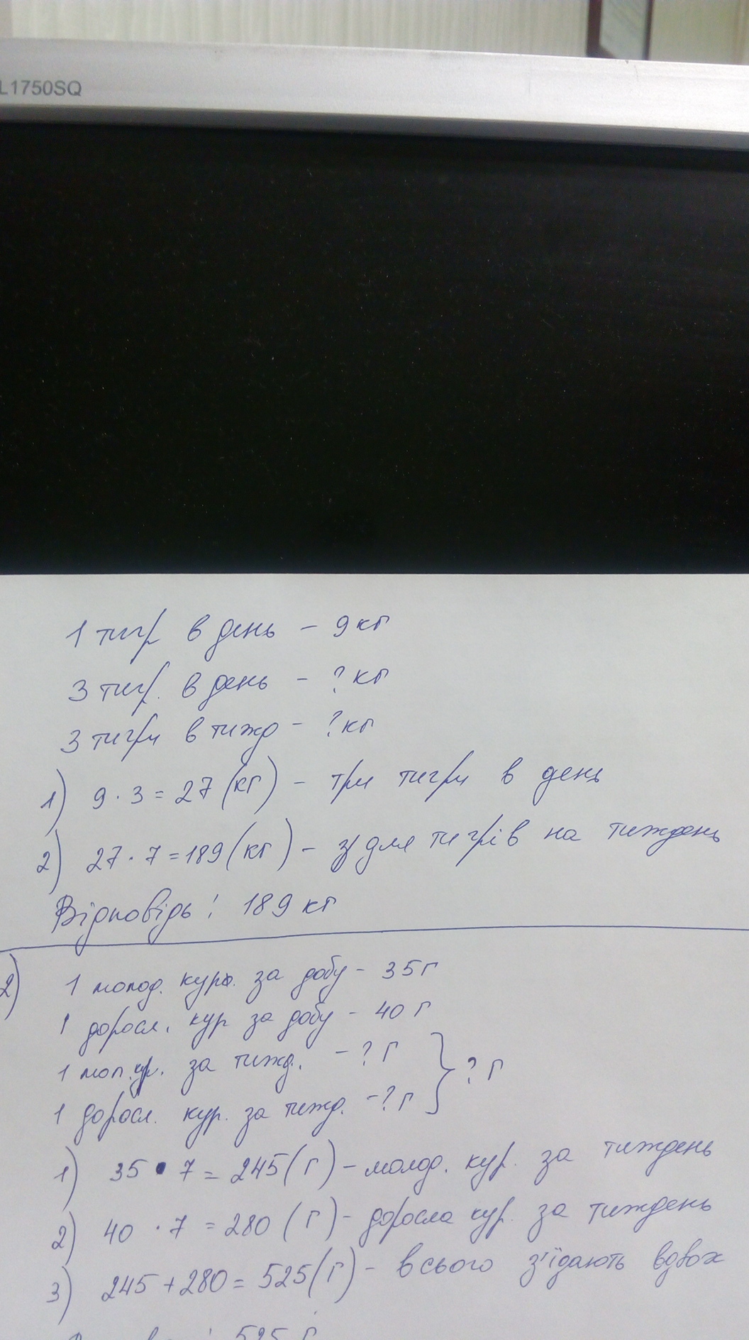 ) У зоопарку добова норма м'яса для одного тигра становить 9 кг. Скільки м'яса потрібно трьом тиграм на тиждень?обернена задача