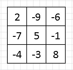 Запишите в клетках квадрата числа -1,+2,-3,-4,+5,-6,-7,+8,-9 так, чтобы по всем гризонталям, вертикалям и дигналям произведения их были положительны