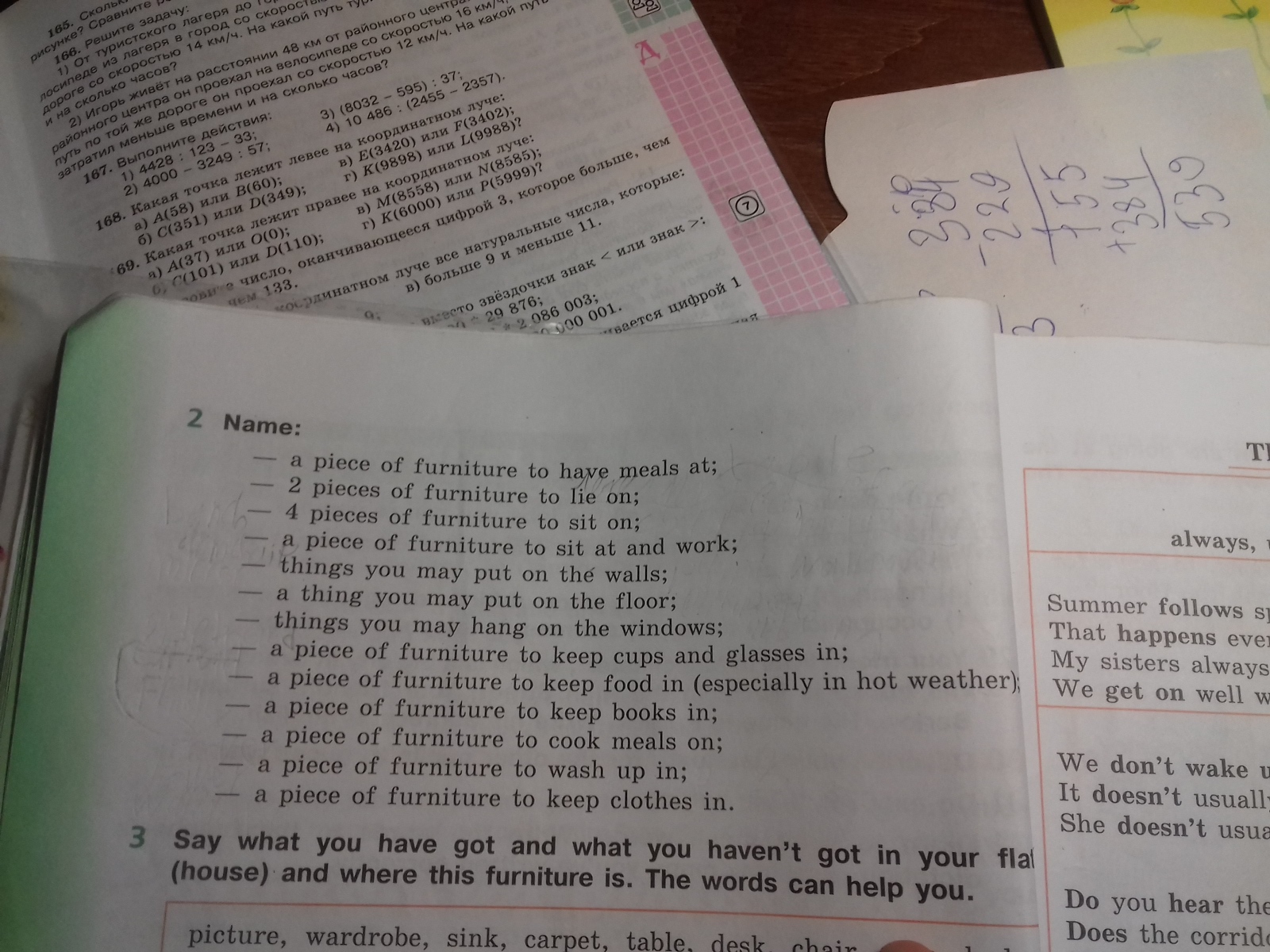 A table; beds; chairs; desk; pictures; carpet; curtains; cupboard; refrigerator; bookshelf; stove; dish-washing machine (sink); wardrobe