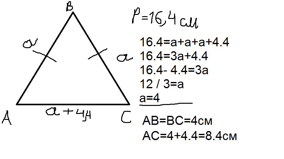 Периметр равнобедренного треугольника=16,4 см. Основание треугольника на 4,4 см больше его боковой стороны . Найдите длину каждой стороны треугольника.