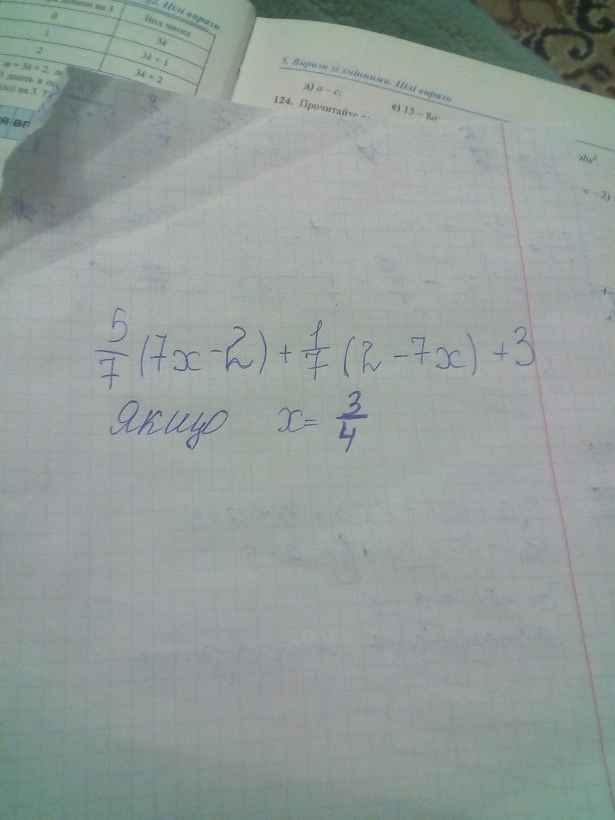 frac{5}{7} (7x-2)+ frac{1}{7}(2-7x)+3= frac{5}{7}*7x- frac{5}{7}*2+ frac{1}{7}*2+ frac{1}{7}*(-7x)+3=