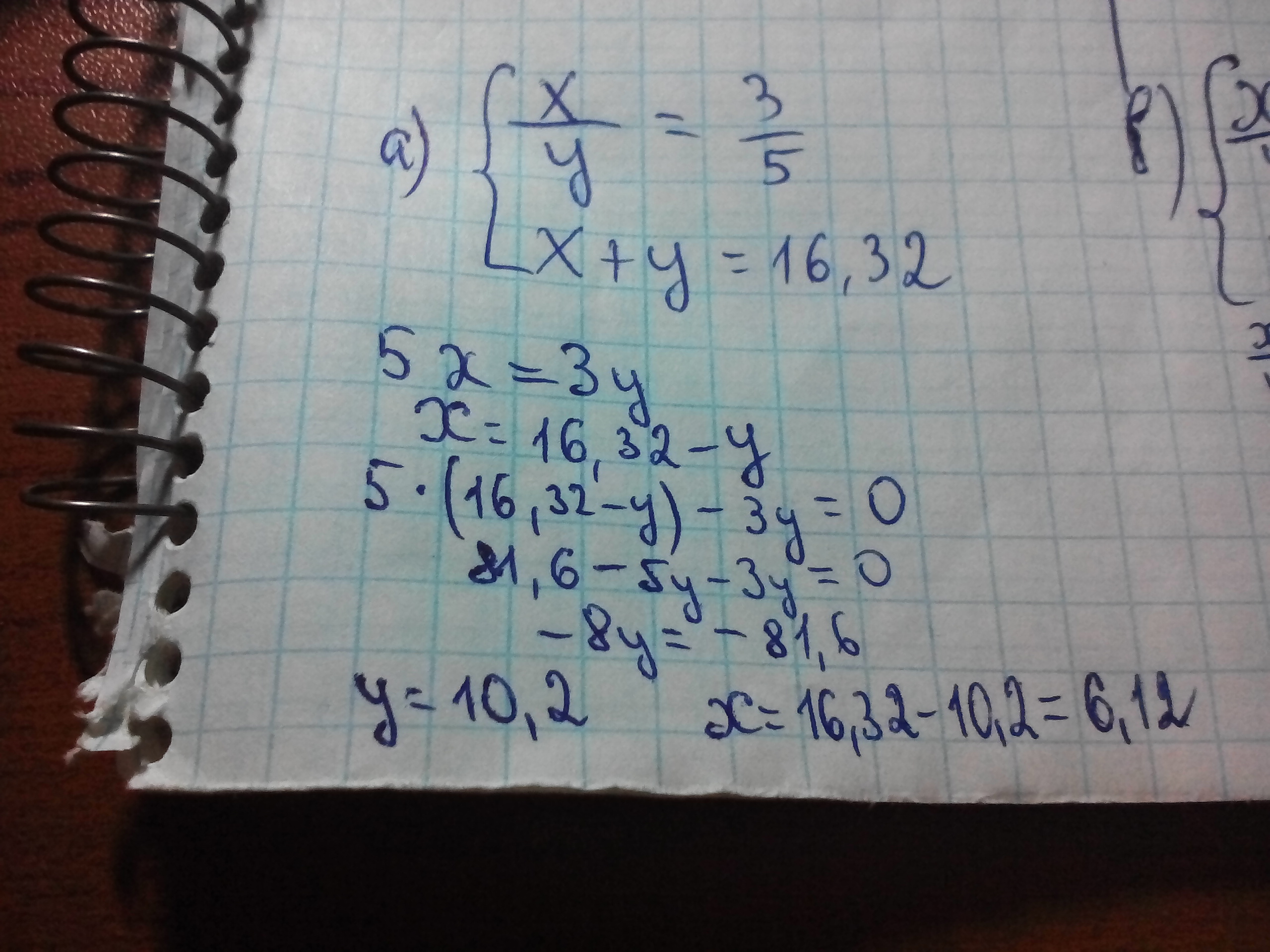 Решите пожалуйста!!! Отношение 2 чисел равно 3/5 найти эти числа если (а, их сумма равна 16,32) (b их разность равна 0,35) (d. их произведение равно 135)