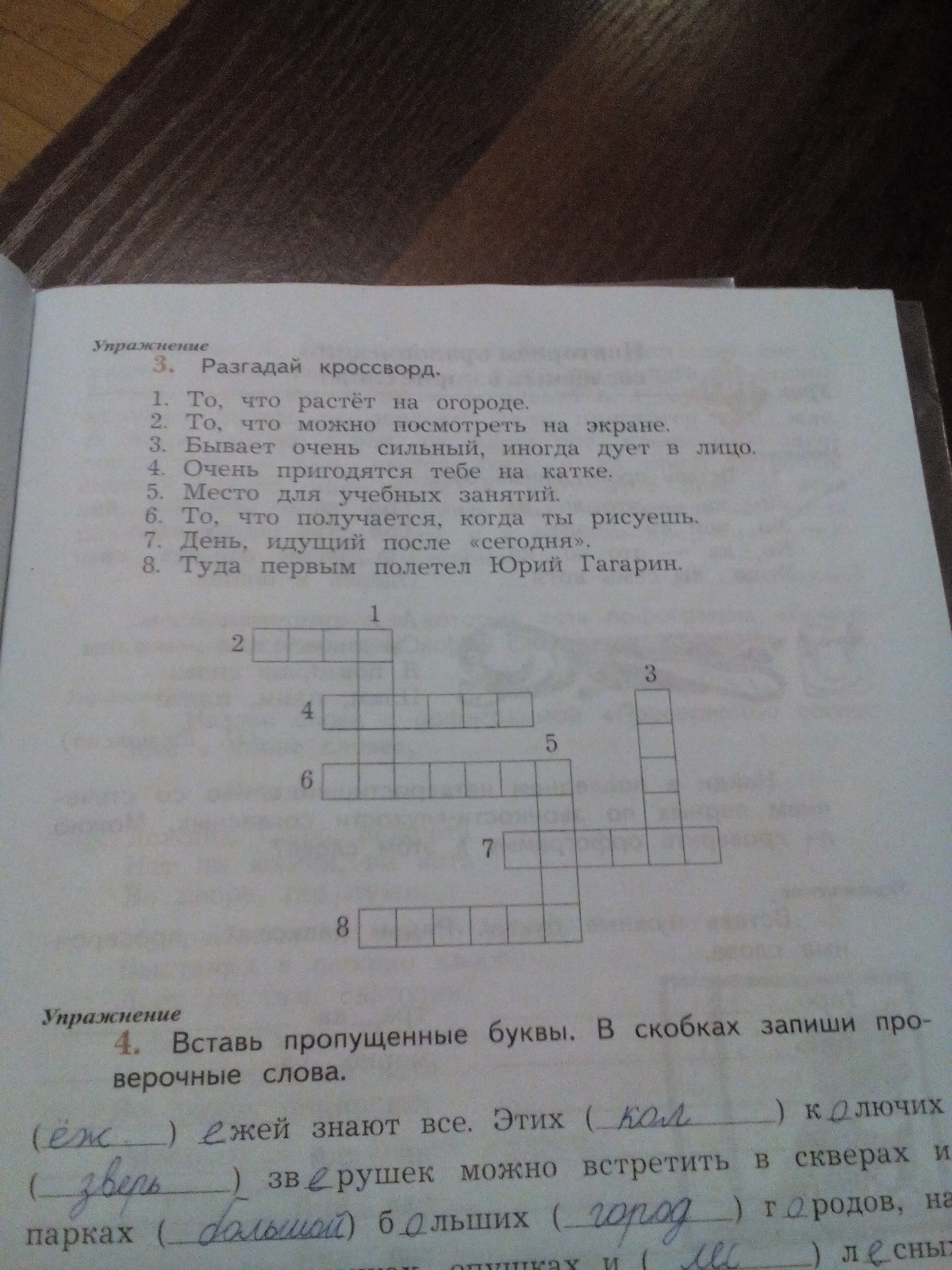 1.овощи. 2. Кино 3. Ветер 4.Коньки. 5.Класс 6. Рисунок 7. Завтра 8. Космос