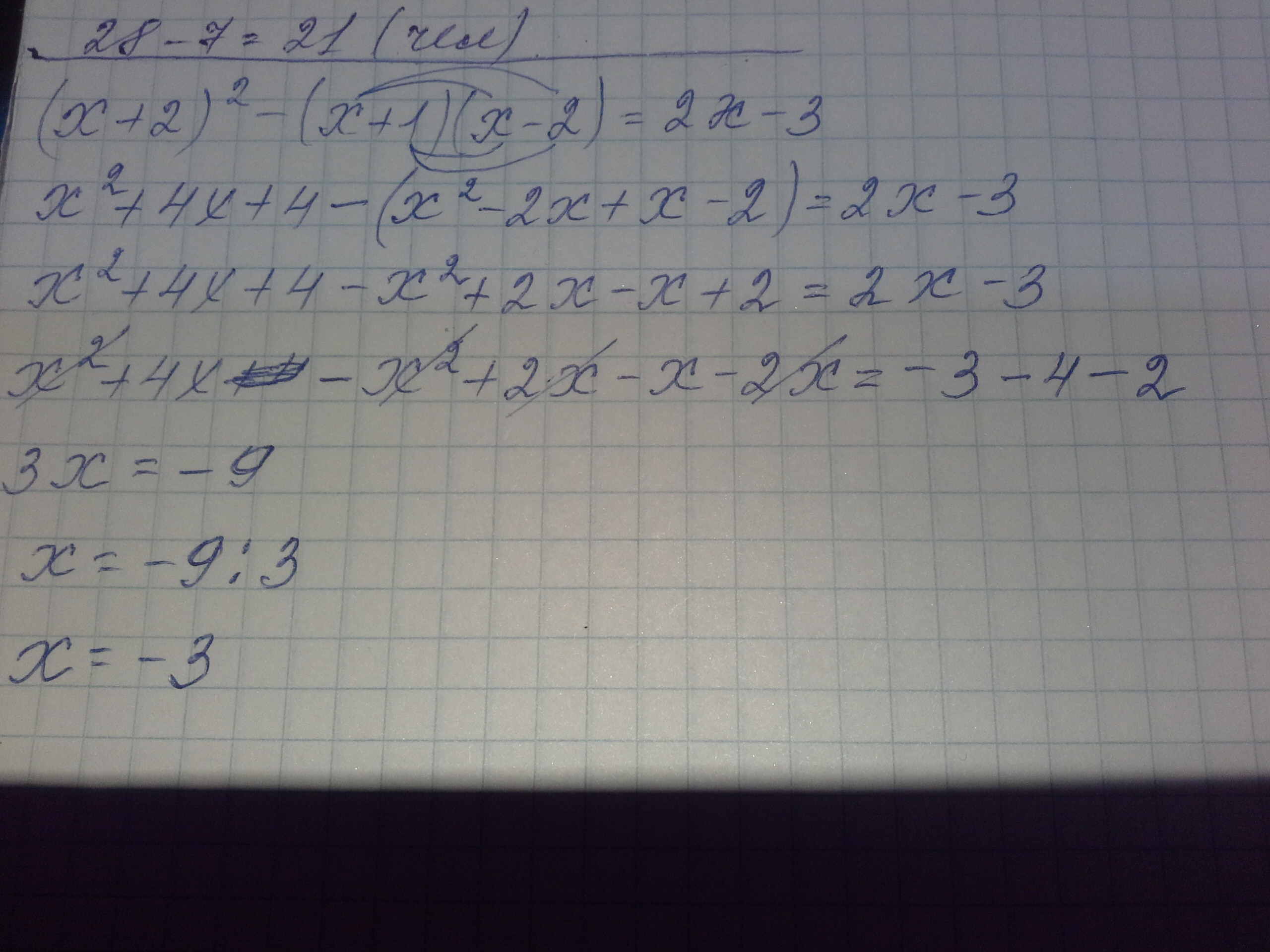 Пожалуйста помогите решить (x+2)^2-(x+1)*(x-2)=2x-3 с подробным описанием, а не просто с ответом. Объясните, что и с чего берётся