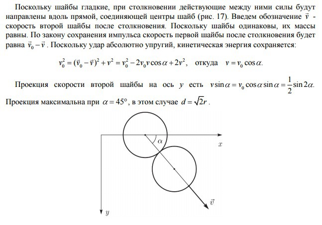 На гладкой горизонтальной поверхности находятся две одинаковые гладкие шайбы радиуса R. Одной из шайб сообщают скорость U0, вторая покоится. Центр второй шайбы находится на расстоянии d < 2 * R от прямой, по которой движется первая шайба. Происходит упругое соударение. При каком значении d проекция скорости второй шайбы на перпендикуляр к U0(вектор) будет наибольшей? Найдите величину этой проекции.
