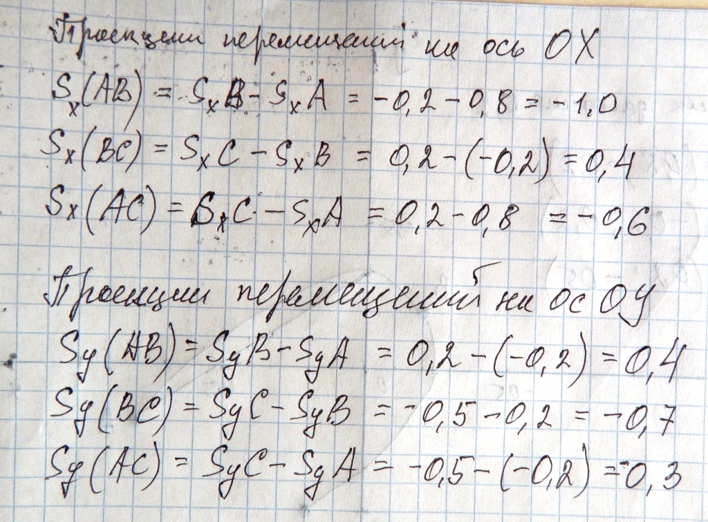 определить цену деления 2)Определить координаты точек 3)перенести рисунок в тетрадь 4)начертить вектора АВ .ВС.АС 5найти проэкций перемещения этих векторов-последнее не дописал