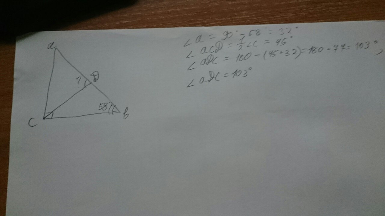 в прямоугольном треугольнике abc из вершины прямого угла проведена биссектриса dc . найдите угол adc если угол b= 58