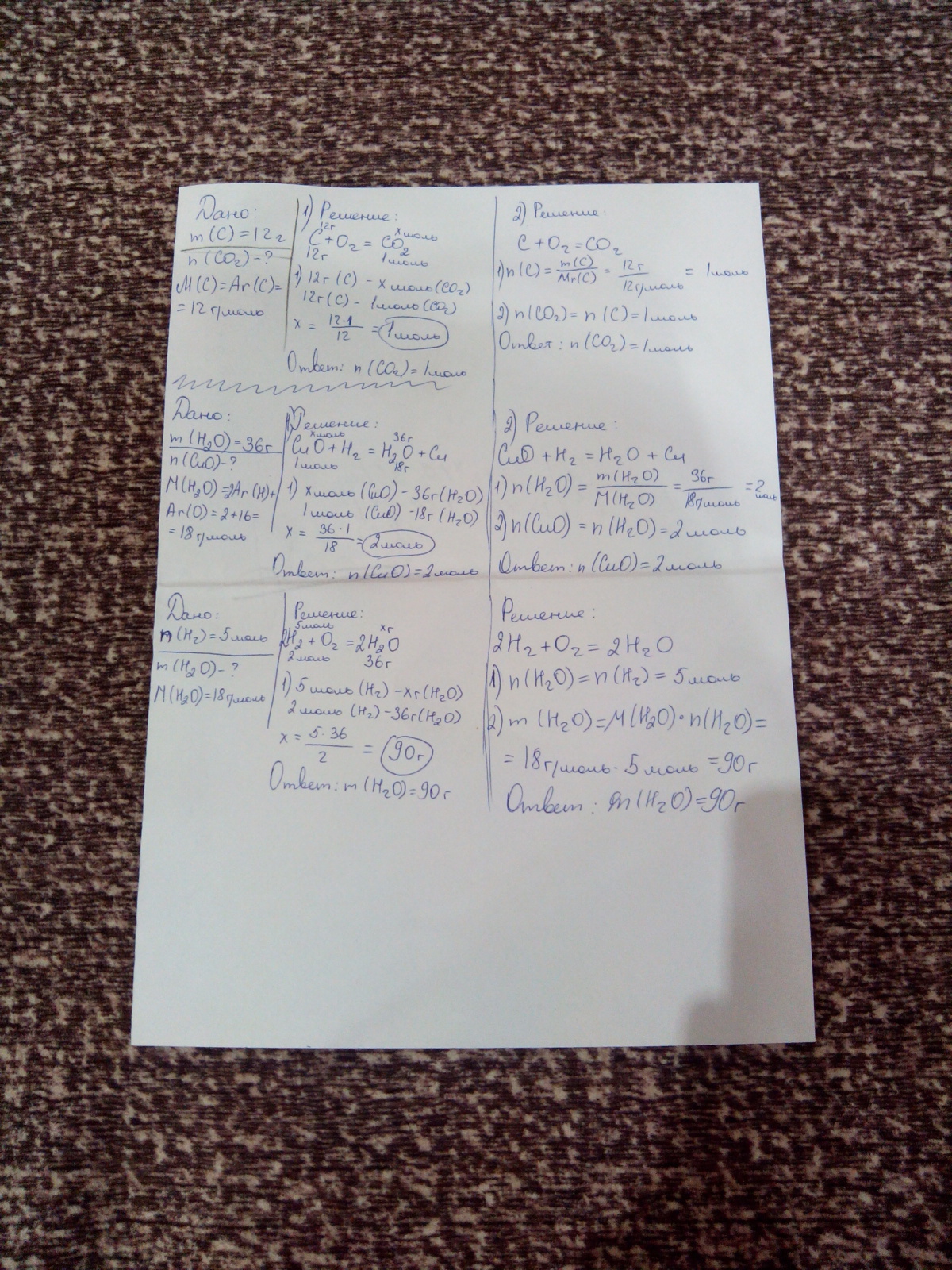 2. При пропускании водорода через оксид меди (II) образовалось 36 г. воды. Найдите количество вещества оксида меди (II).
