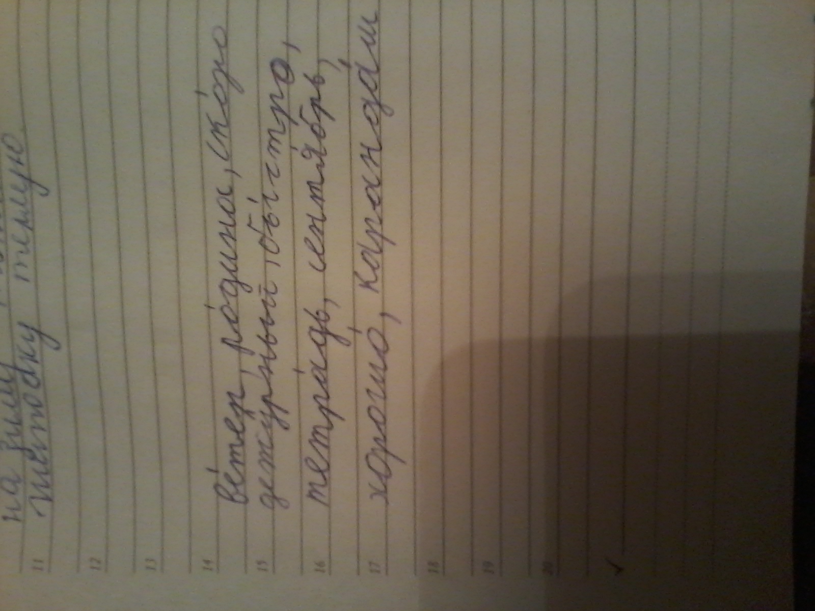 ве*тер, ро*дина, ско*ро, дежу*рный, бы*стро, тетра*дь, сентя*брь, хорошо*, каранда*ш