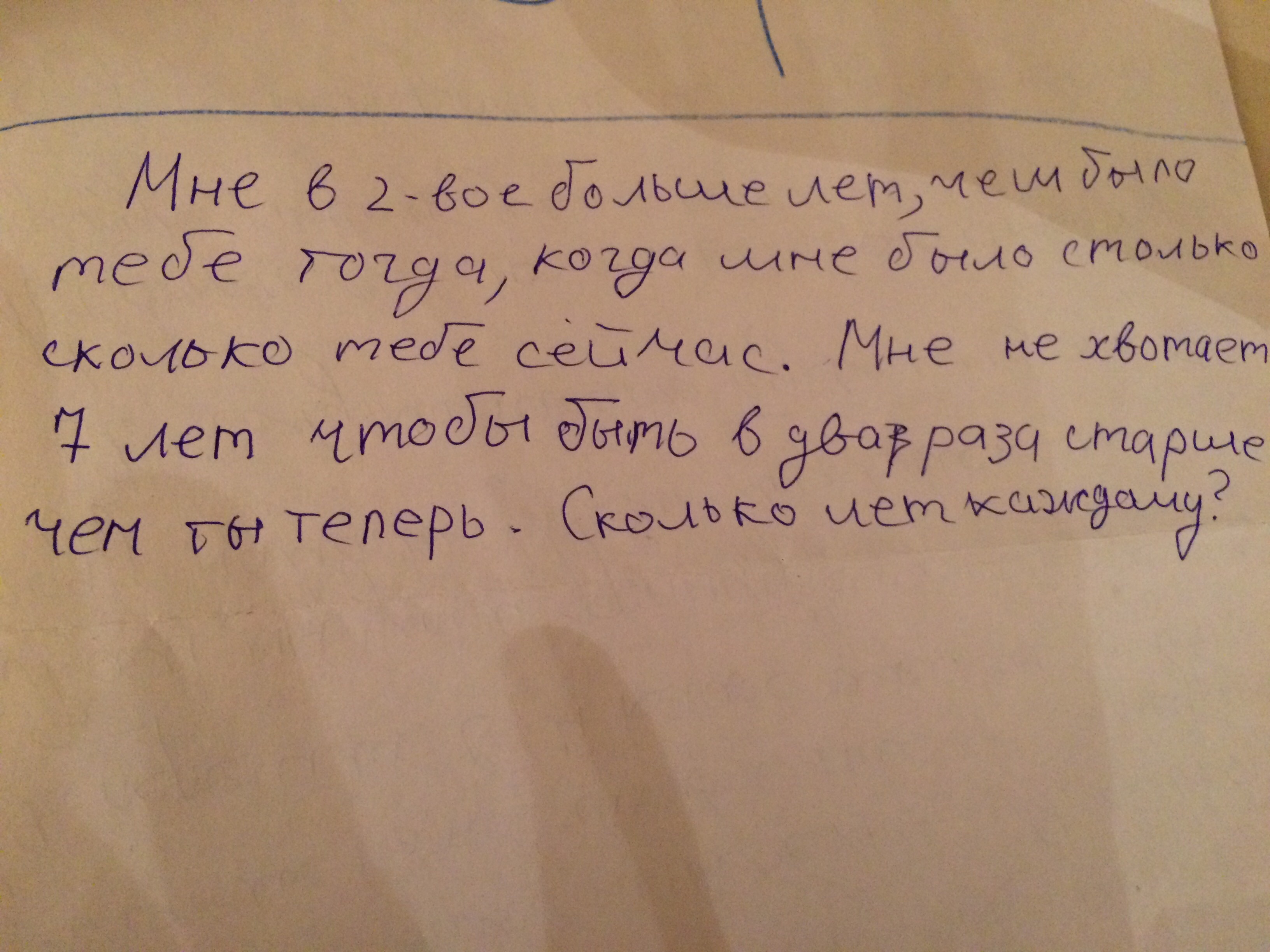 Мне, в двое больше лет, чем было тебе тогда, когда мне было столько, сколько тебе сейчас. Мне не хвотает 7 лет чтобы быть в два раза старше чем ты теперь. Сколько лет каждому?