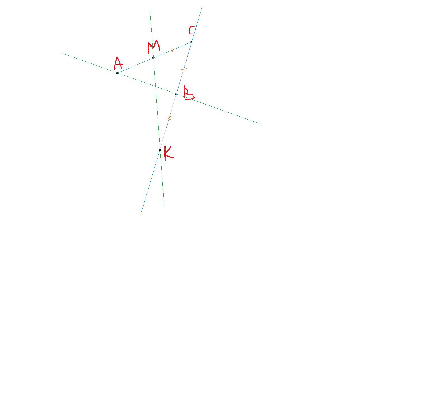 Точка А не лежит на прямой ВС. Точка М - середина отрезка АС, точка В - середина отрезка СК.