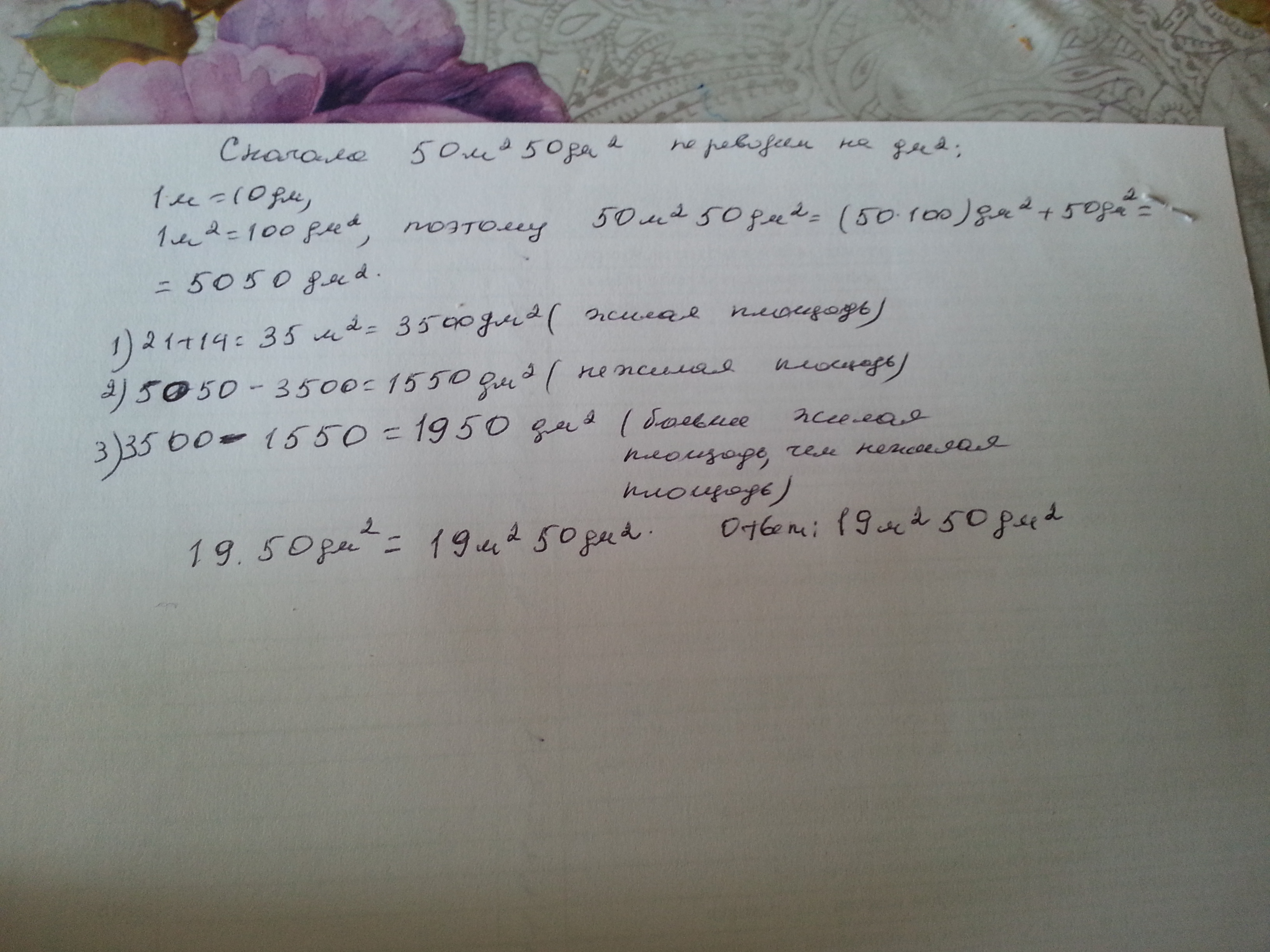 Реши задачу. Вычисли и запиши ответ. Площадь комнат двухкомнатной квартиры составляет 21кв. м и 14 кв. м а общая площадь-50 кв.м 50кв.дм. На сколько больше жилая площадь этой квартиры, чем нежилая?