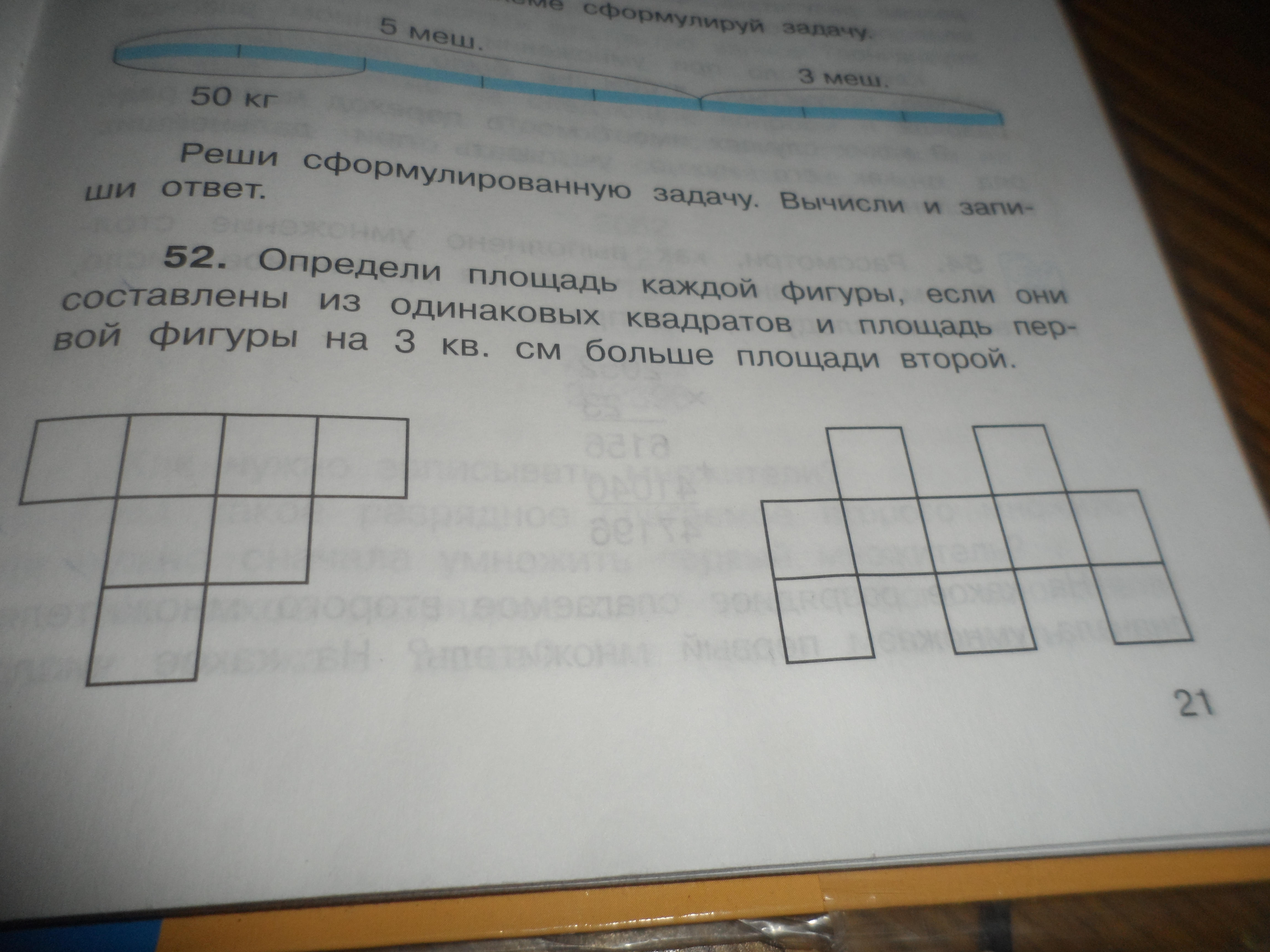 определи площадь каждой фигуры, если они составлены из одинаковых квадратов и площадь первой фигуры на 3 кв.см больше площади второй.. как написать?