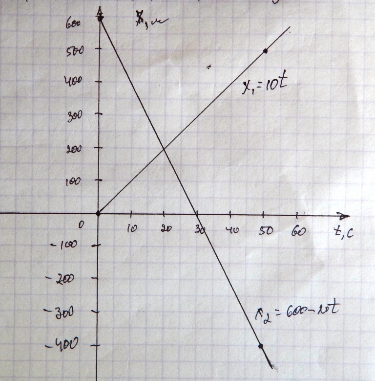 Автобус и мотоциклист движутся навстречу друг другу со скоростями соответственно 10 и 20м/с. Расстояние между ними в момент начала наблюдения равно 600м. Считая, что ось Х направлена в сторону движения автобуса и при t=0 положение автобуса совпадает с началом отсчёта, написать для автобуса и мотоциклиста уравнения х=х(t). Изобразить эти зависимости в виде двух графиков на одном чертеже(рекомендуемые масштабы: в 1см 100м, в 1см 10с