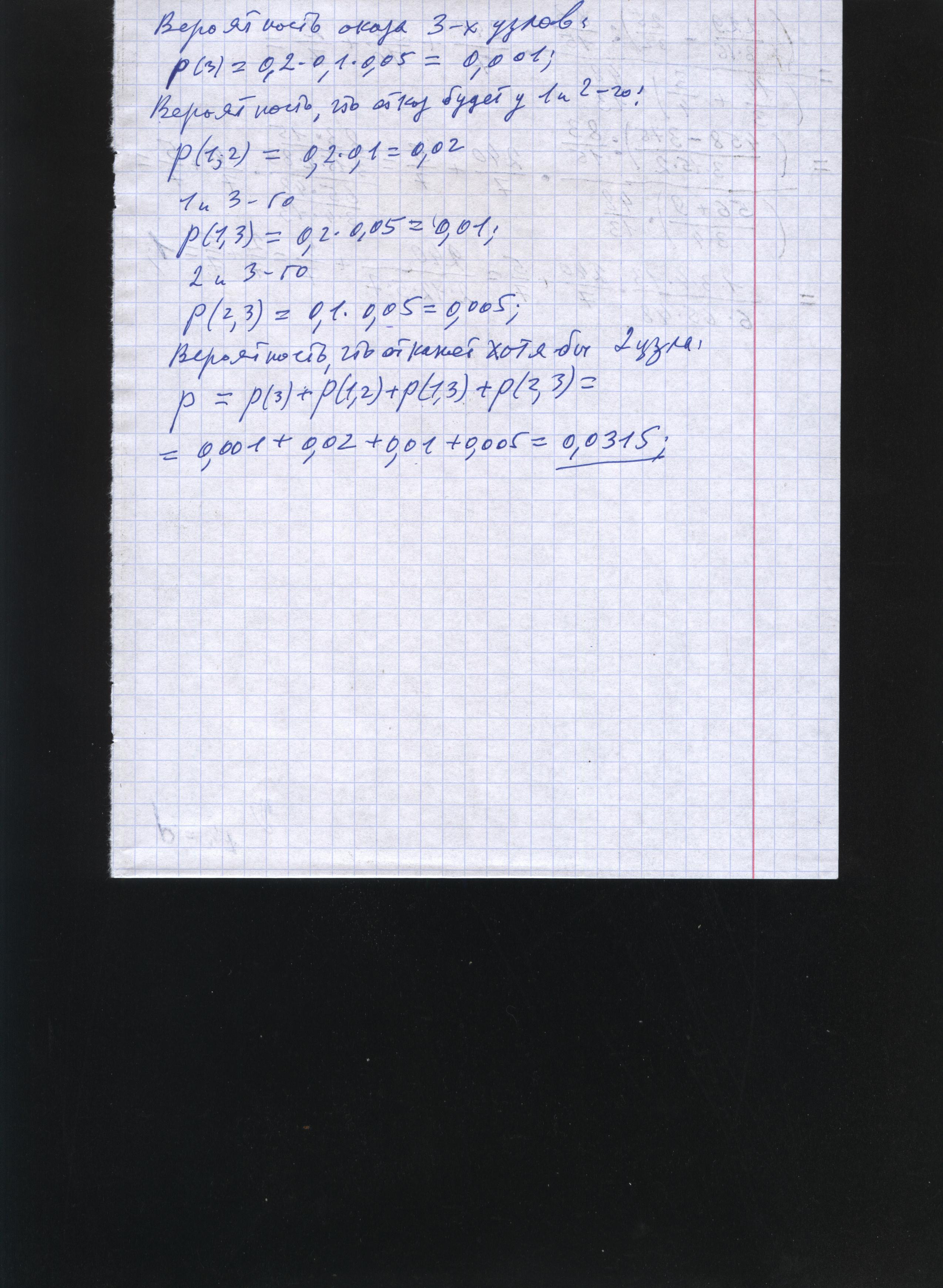 да, я дал маху, даже в сумме ошибся (0,36 у меня сумма), старый и подзабыл, не учел вероятность третьего узла, 3 последних слагаемых надо соответственно умножить на вероятности не выхода из строя третьих, 0,02*0,95=0,019, 0,01*0,9=0,009, 0,005*0,8=0,004, 0,001+0,019+0,009+0,004=0,033