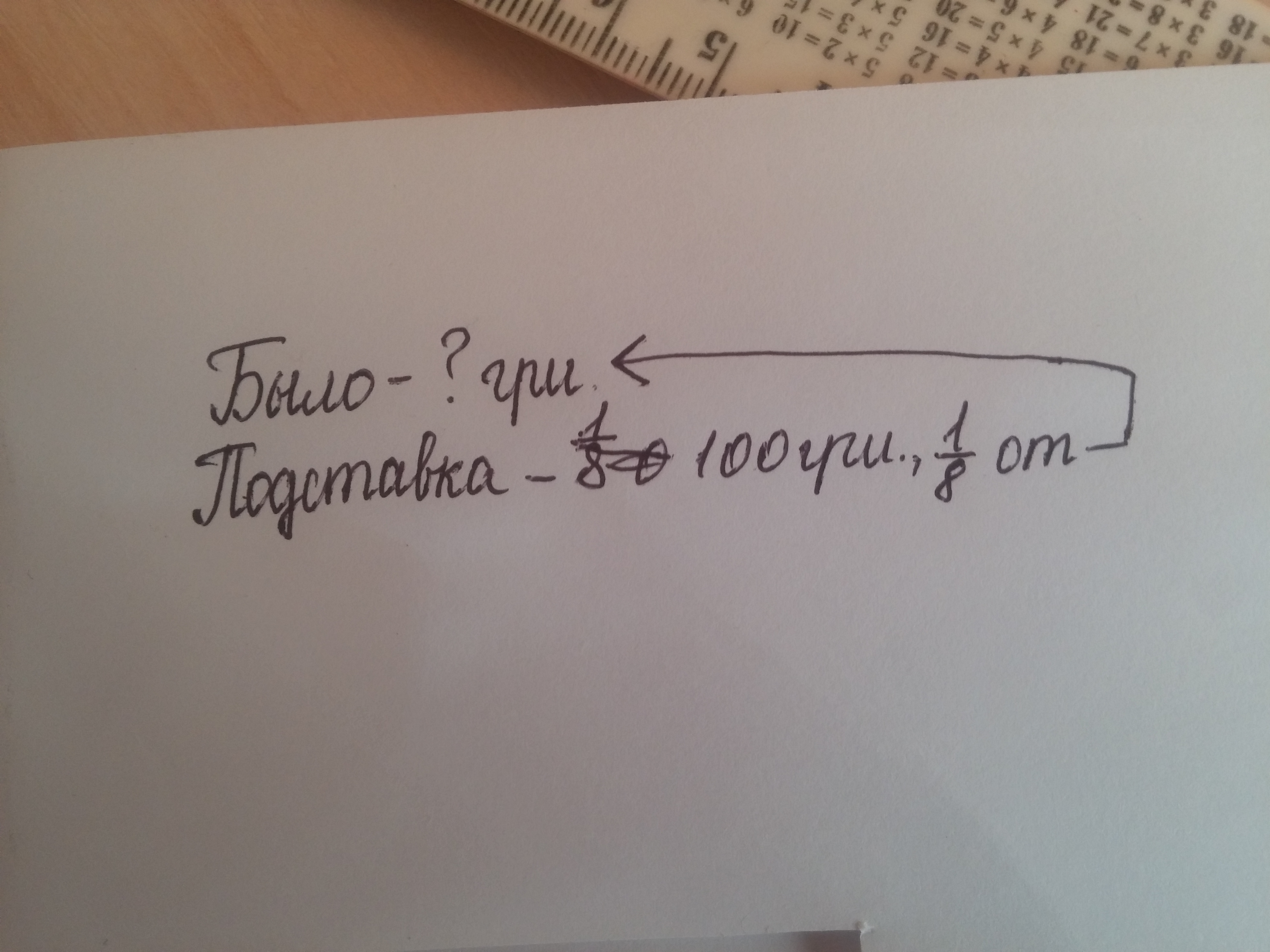 Хозяйка купила подставку под ноутбук за 100 грн.Она потратила одну восьмую денег,которые были у неё.Сколько денег было у хозяйки? Пожалуйста помогите правильно оформить условие задачи