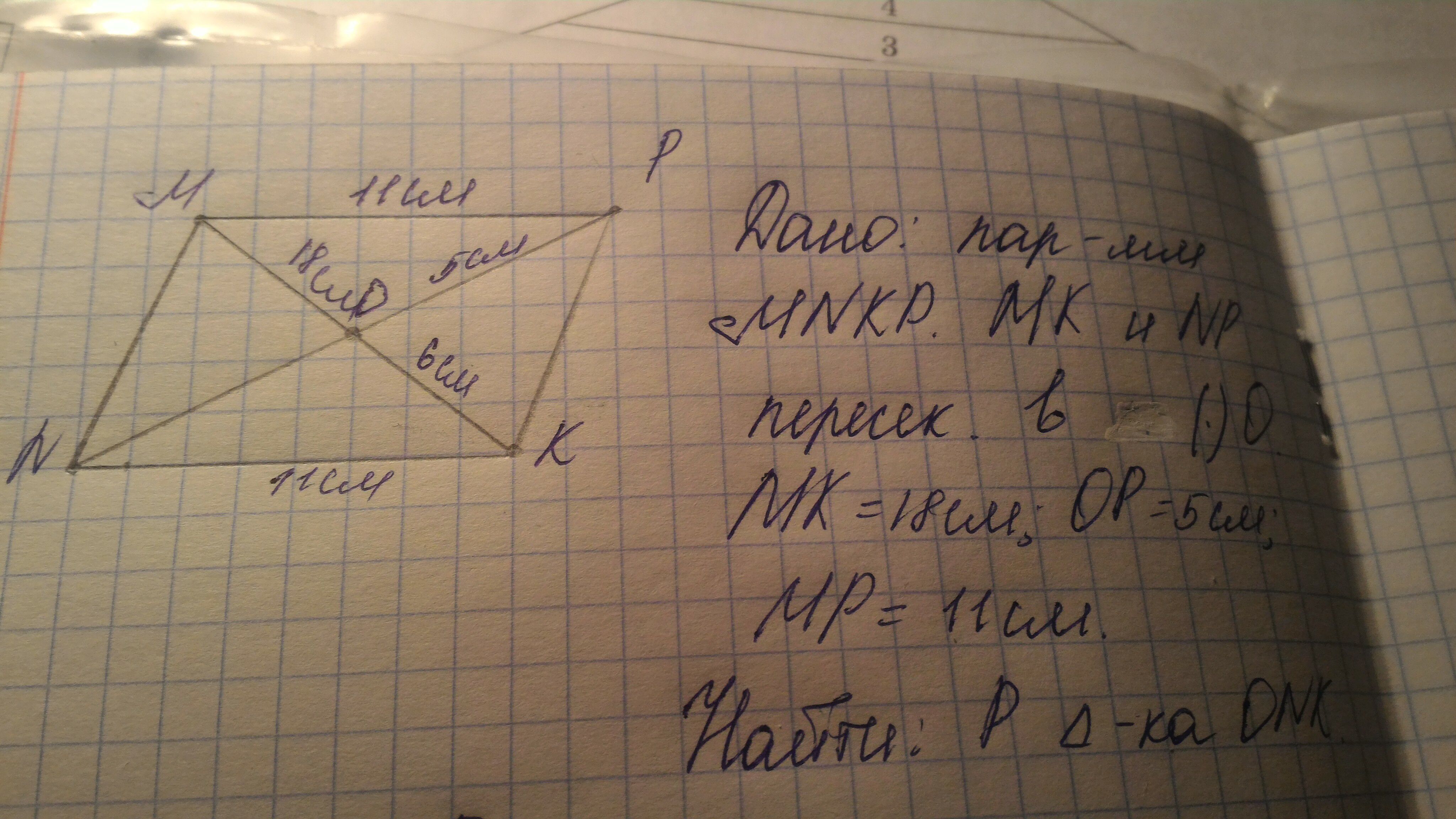 Диагонали параллепипеда MNKP пересекаются в точке О,найти периметр треугольника ONK,если MK=18 см OP=5 MP=11