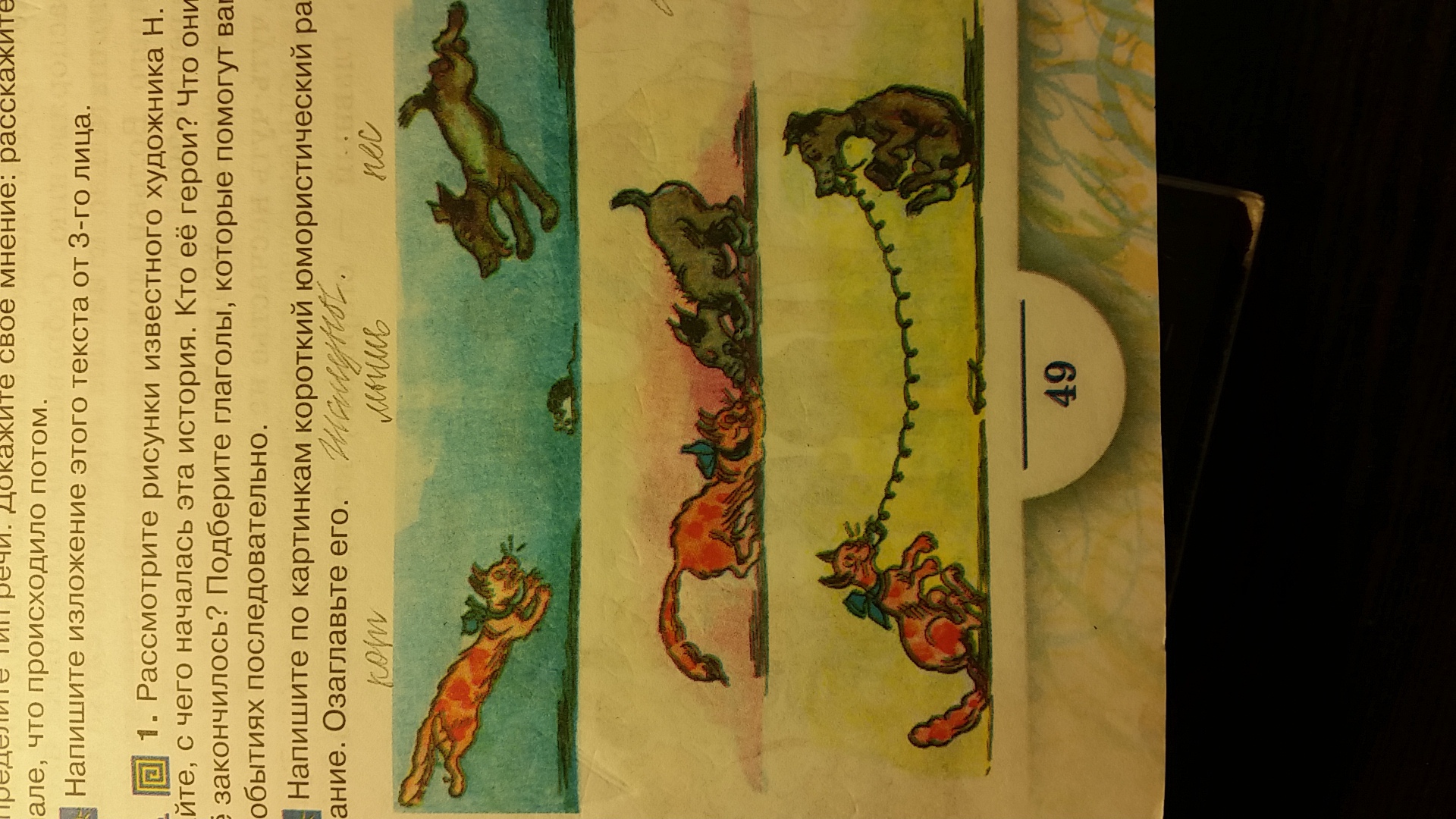 рассмотрите рисунки известного художника Радлова.Подумайте с чего началась эта история.Кто ее герои?Что они делают?Чем всё закончилось?Подбери глаголы, которые помогутвам рассказать о событиях последовательно. Напишите по картинкам короткий юмористический рассказ-повествование.Озаглавьте его.