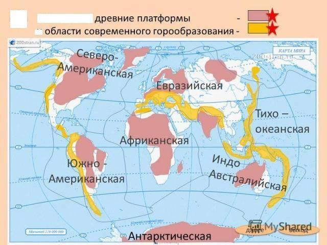 40 баллов!!сррчно!!!Подпишите на контурной карте название литосферных плит обозначьте древние платформы и области современного горообразования.