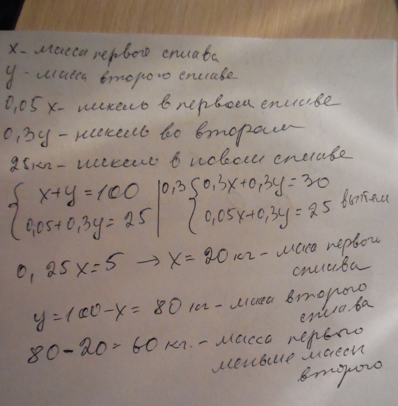Имеется два сплава. Первый содержит 5% никеля, второй - 30% никеля. Из этих двух сплавов получили третий сплав массой 100 кг, содержащий 25% никеля. На сколько килограмов масса первого сплава меньше массы второго?