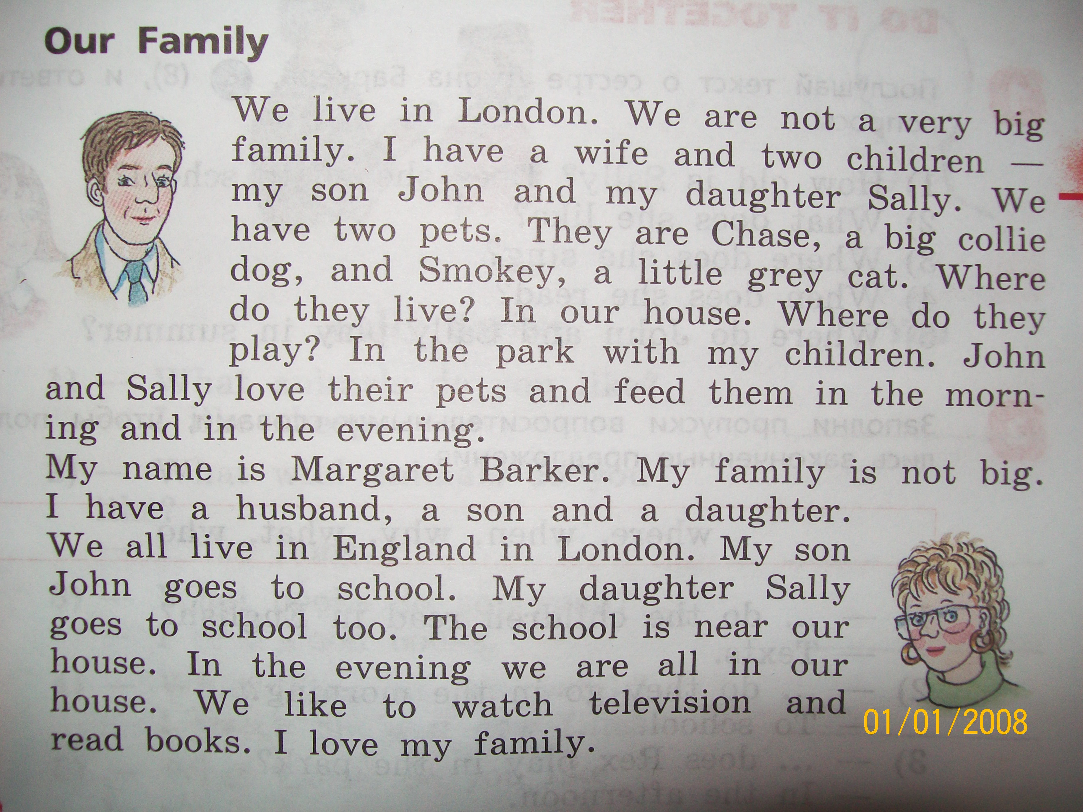 Мы живем в Лондоне.Мы не очень большая семья.У меня есть жена и 2 детей-мой сын Джон и моя дочка Сэлли.У нас есть два щенка.