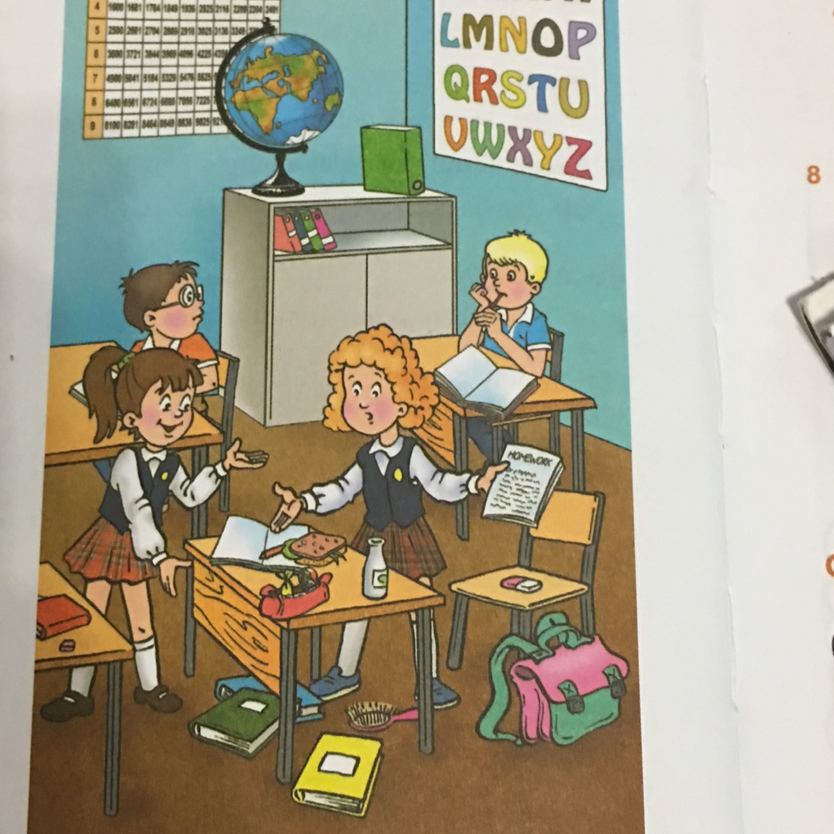 RUBBER , SWEETS, MAGAZINE, HOMEWORK, CHAIR, DESK, HAND , BOOKS, PENCIL CASE , BAG , POSTERS, HAIRBRUSH, RULER, PENCIL SHARPENER , CHOCOLATE.