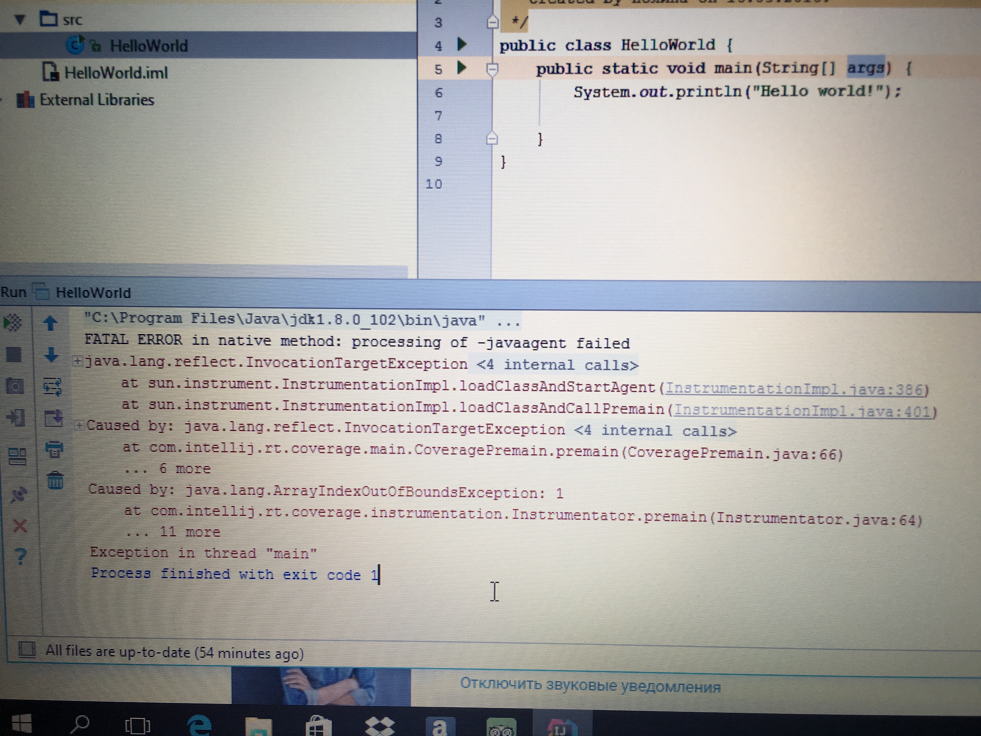 Самая примитивная программа "Hello World" на Java, не выводит фразу в консоль (ошибка при компиляции?).