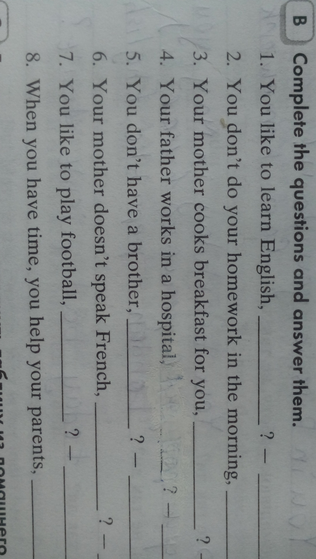 Первую часть буду писать только пропущенную концовку, все предложение переписывать не стану. 1. Don't you? Yes, I do, it's my favourite language. 2. Do you? No, I don't, I do my homework in the evening. 3. Doesn't she? Yes, she does, she cooks breakfast for me almost every morning. 4. Doesn't he? Если твой отец работает в больнице можешь ответить "yes,he does, he is a *вставь его профессию*", а если не работает, то "no, he doesn't, he is a *вставь его профессию*". 5. Do you? Если есть брат то "Yes, I do actually have a brother", если нет то "No, I don't have a brother". 6. Does she? Если мама новорит по-французски то, "Yes, she does", а если не говорит то "No, she doesn't можешь еще добавить "but she speaks English например или другой язык, если она говорит на другом языке". 7. Don't you? Если нравится играть в футбол то "yes, I do, it's my favourite sport", а если нет, то "No, I don't, I prefer *вставь спорт который нравится*". 8. Don't you? Yes, I do, I always try to help my parents.