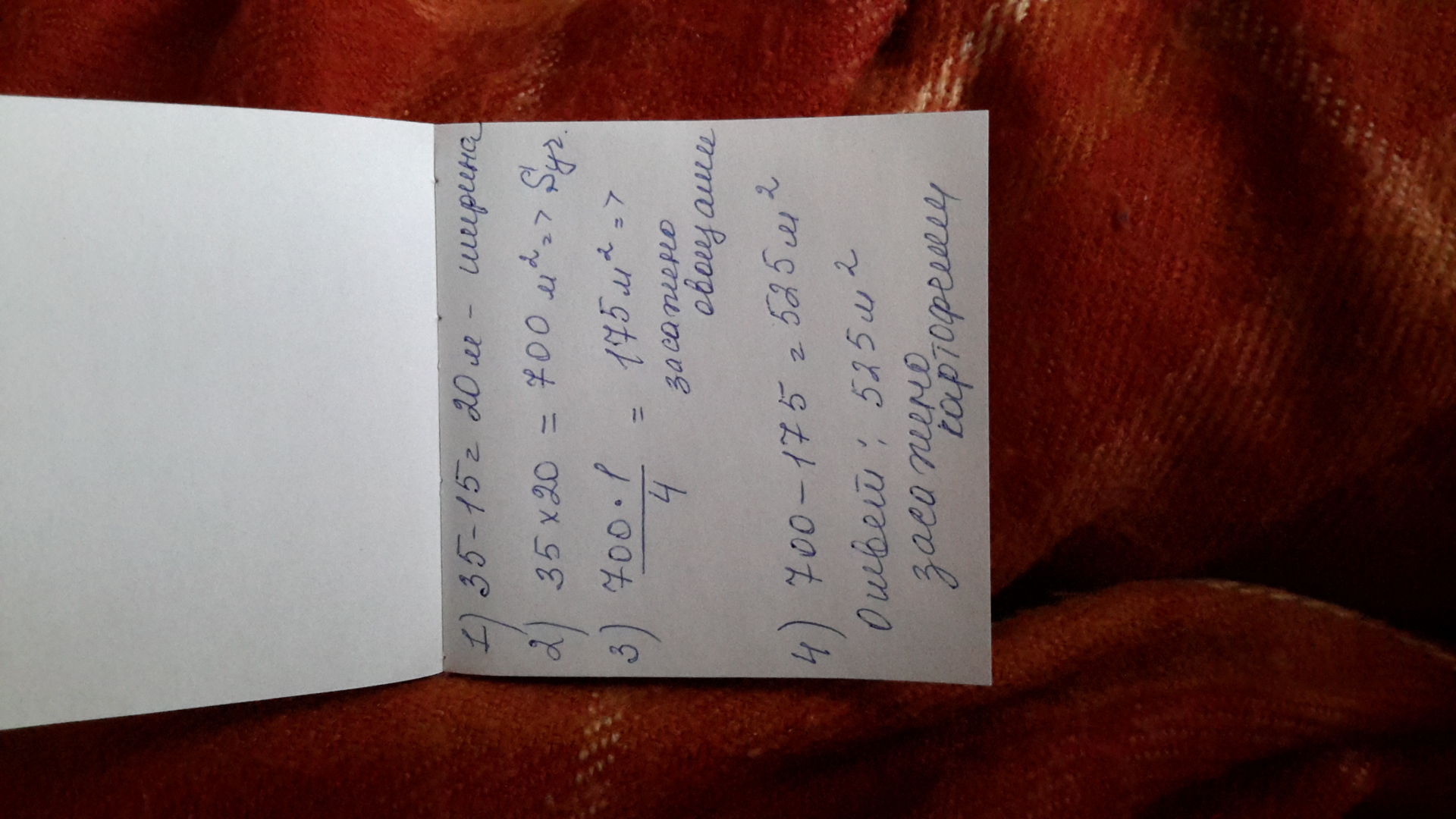 помогите решить задачу Длина огородного участка 35м.ширина на 15 метров короче..четверть всей площади уч-ка засажена овощами.остальная кортофелем.какую площадь занимает картофель?