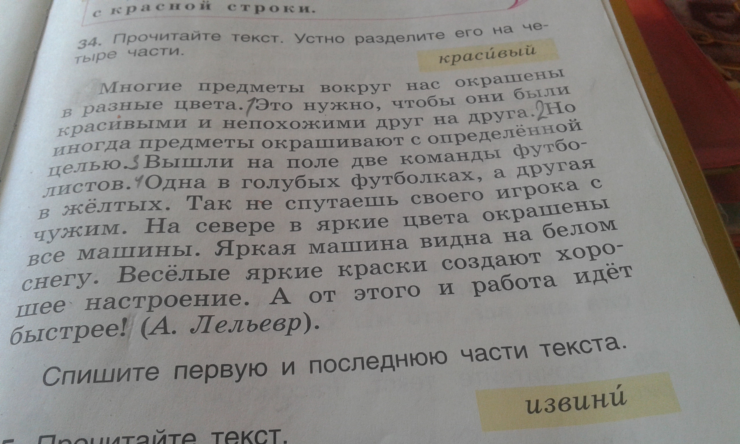 1 часть - многие предметы...; 2 часть - вышли на поле...; 3 часть - на севере в яркие...; 4 часть - веселые яркие краски