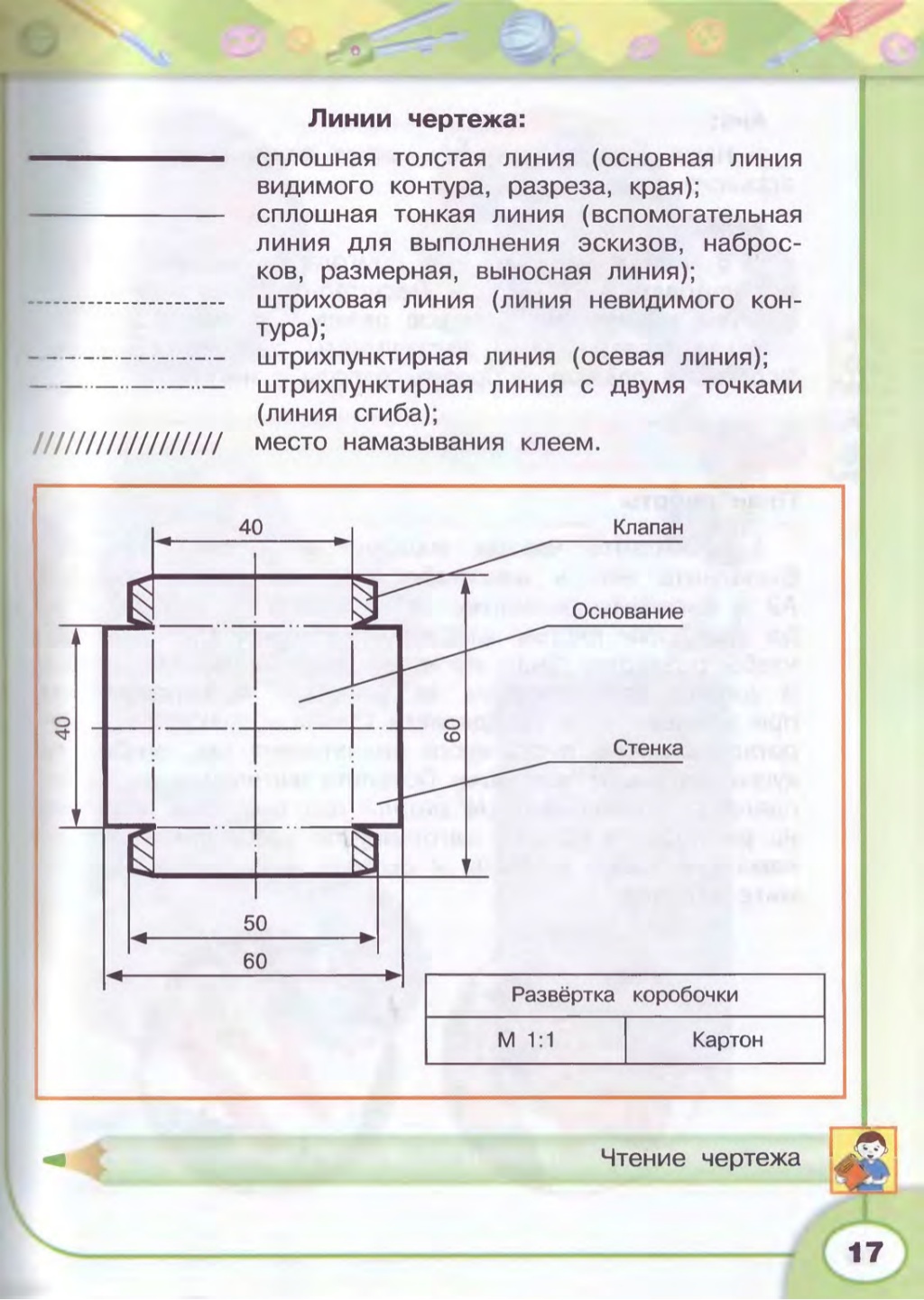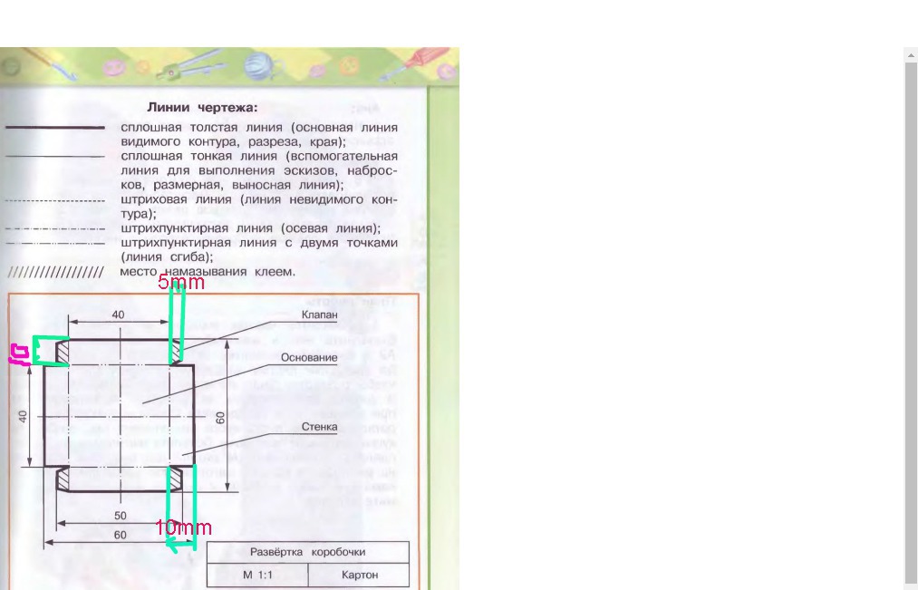 Определить и записать согласно чертежа: длину клапана,основания,стенки (в мм)., ширину клапана,основания,стенки (в мм).