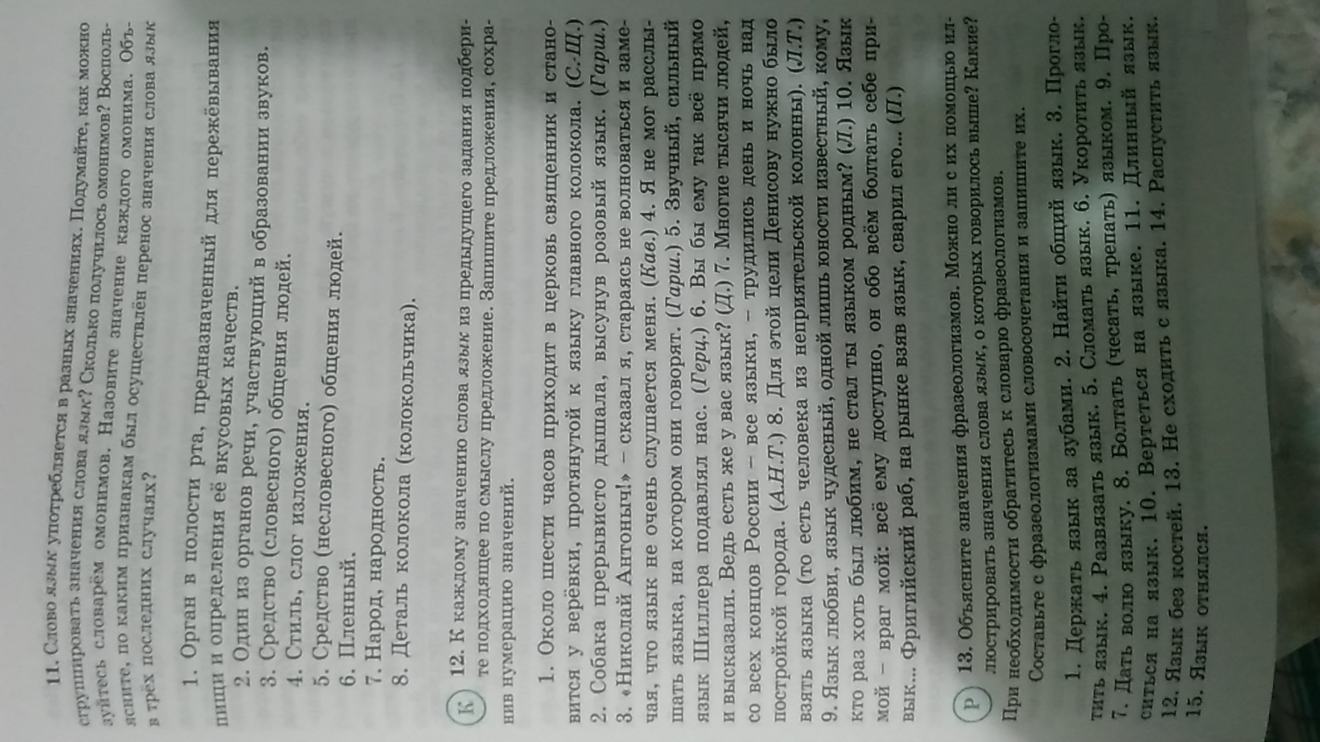 Тут нужно из упражнения 12 выписать все предложения, и к каждому из них подобрать лексическое значение слова ,,язык,, (из упражнения 11)