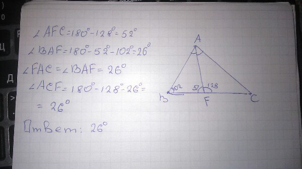В треугольнике ABC проведена биссектриса AF, угол AFC равен 128, угол ABC равен