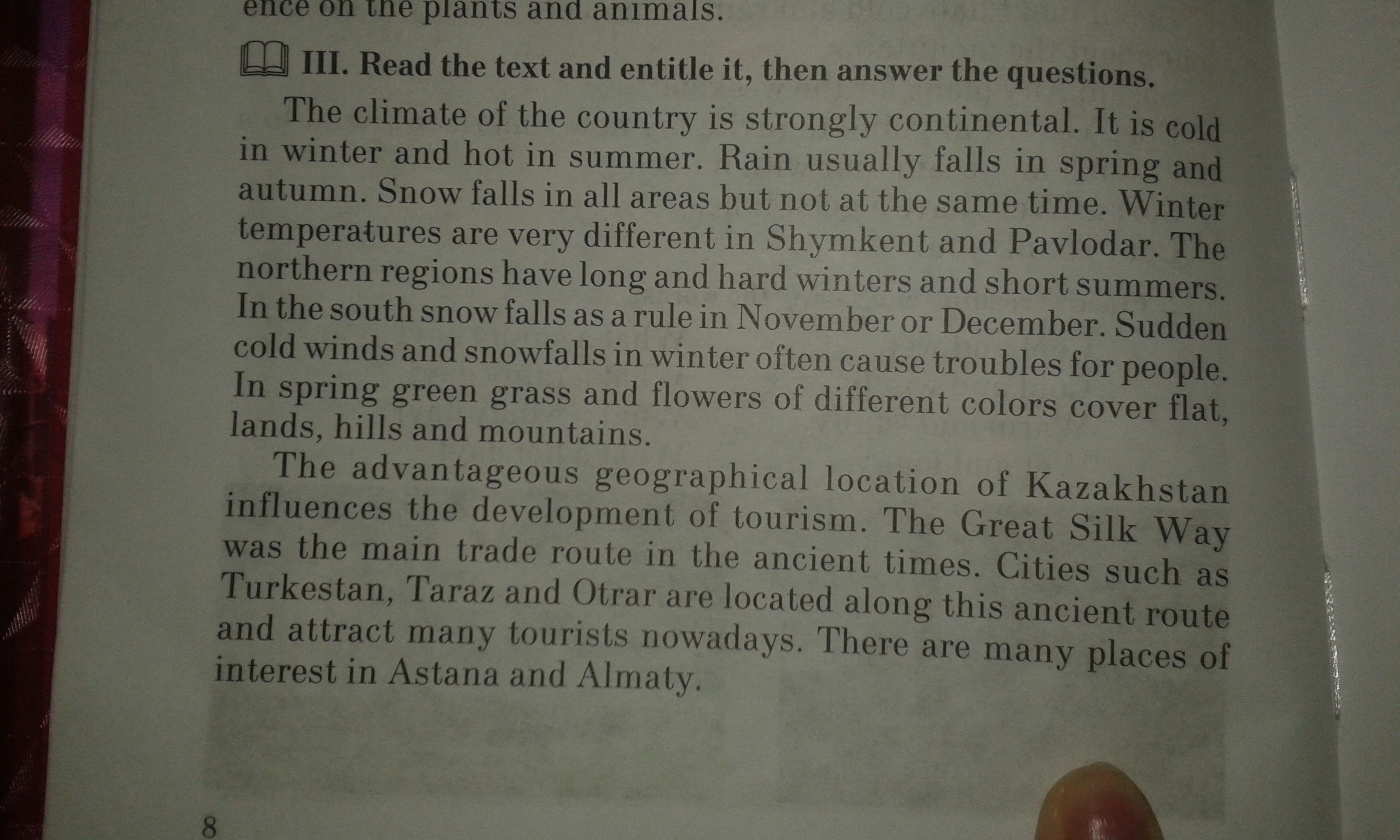 Климат страны резко континентальный. Холодно зимой и жарко летом. Дождь обычно капает весной и осенью. Снег выпадает во всех областях, но не одновременно. Зимние температуры сильно отличаются в Шымкенте и Павлодаре. В северных регионах имеют длинные и жесткие зимой и коротким летом. На юге выпадает снег, как правило, в ноябре или декабре. Резкие холодные ветры и снегопады зимой часто вызывают проблемы для людей. Весной зеленой траве и цветы разных цветов покрывают плоские, земли, холмы и горы, выгодное географическое расположение Казахстана оказывает влияние на развитие туризма. Великий шелковый путь был основным торговым маршрутом в древние времена. Такие города, как Туркестан, Тараз и Отрара расположены вдоль это маршрута и ЛОР привлекают множество туристов в наши дни. Есть много интересных мест в Астане и Алматы.