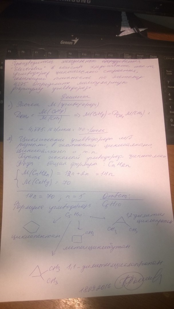 Производитель холодильного оборудования «Electrolux» в качестве хладагента использует углеводород, циклического строения, имеющий плотность по метану 4,375. Определите молекулярную формулу этого углеводорода. Составьте его структурную формулу.