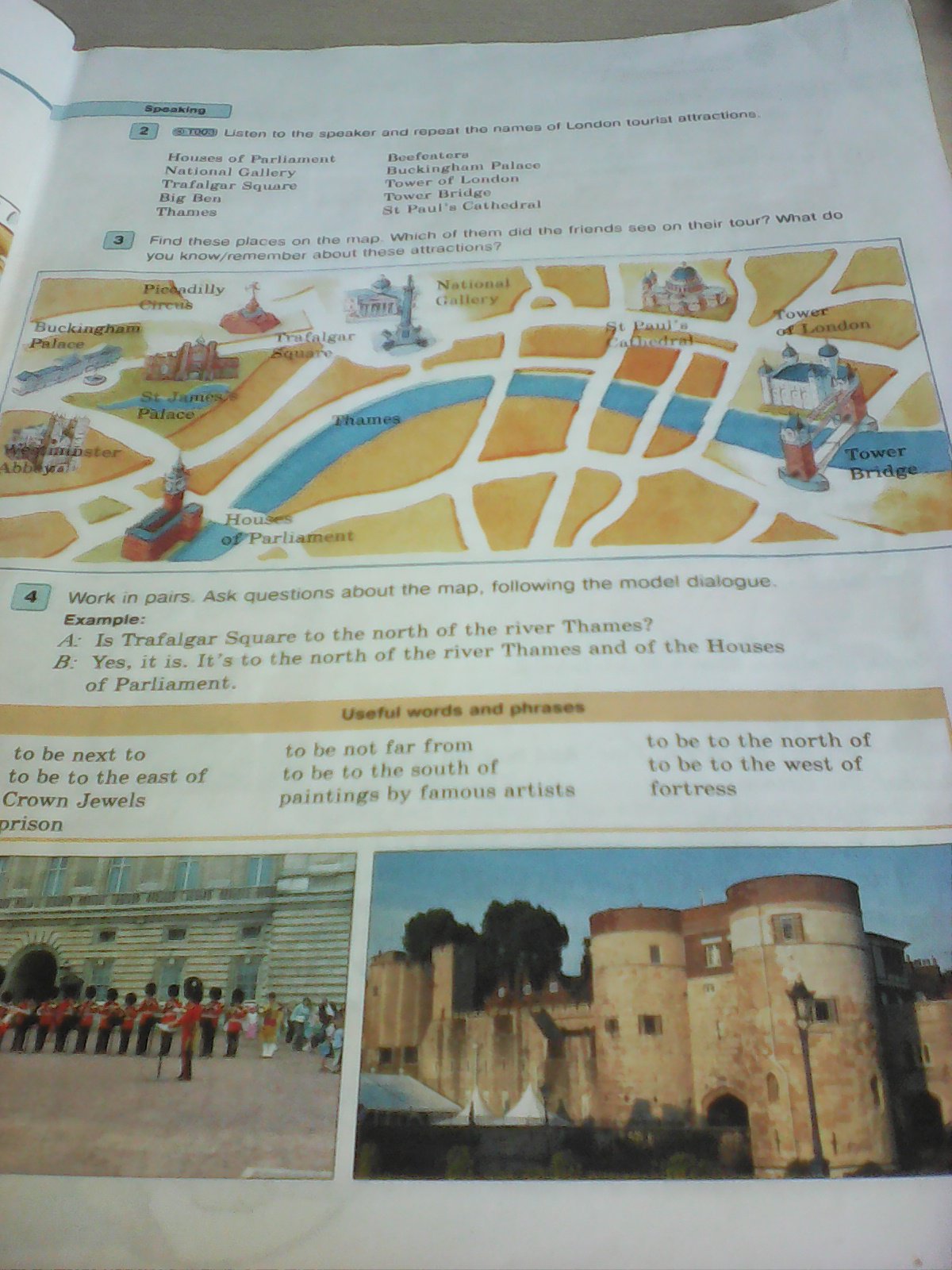 СРОЧНО!!!!!!!!!!!!!!!!!!!!! Work in pairs. Ask questions about the map, following the model dialogue. Example: A: Is Trafalgar Square to the north of the rive r Thames? B: Yes, it is. It s to the north of the river Thames and of the Houses of Parliament Useful words and pharases to be next to to be not far from to be to the north of to be to the east of to be to the south of to be to the west of Crown Jewels paintings by famous artists fortress prison(подробнее на картинке)