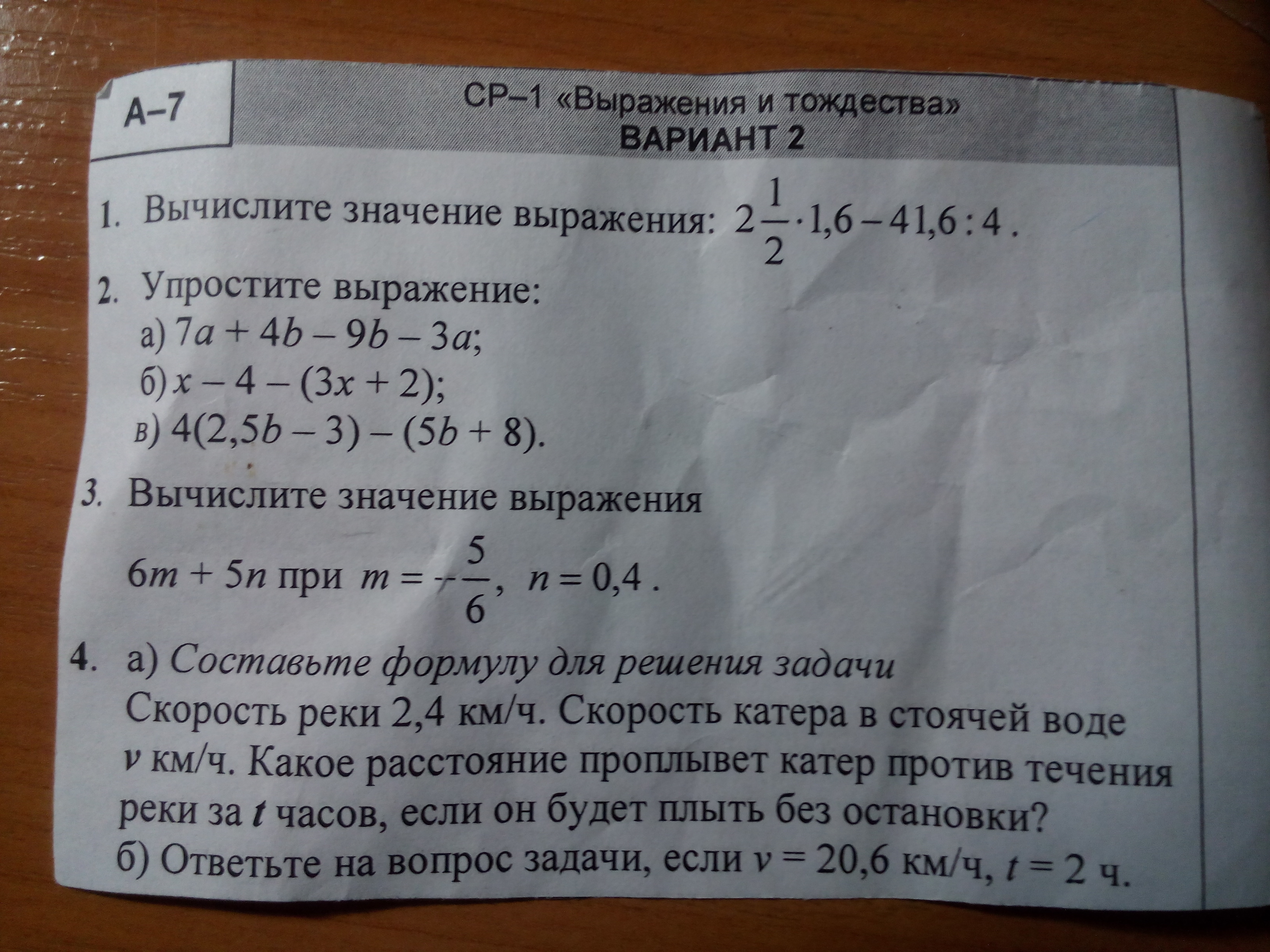 Если v=20,6, t=2,то 20,6*2-2,4*2=41,2-4,8=36,4(км)-проплывёт катер против течения реки за 2 часа.