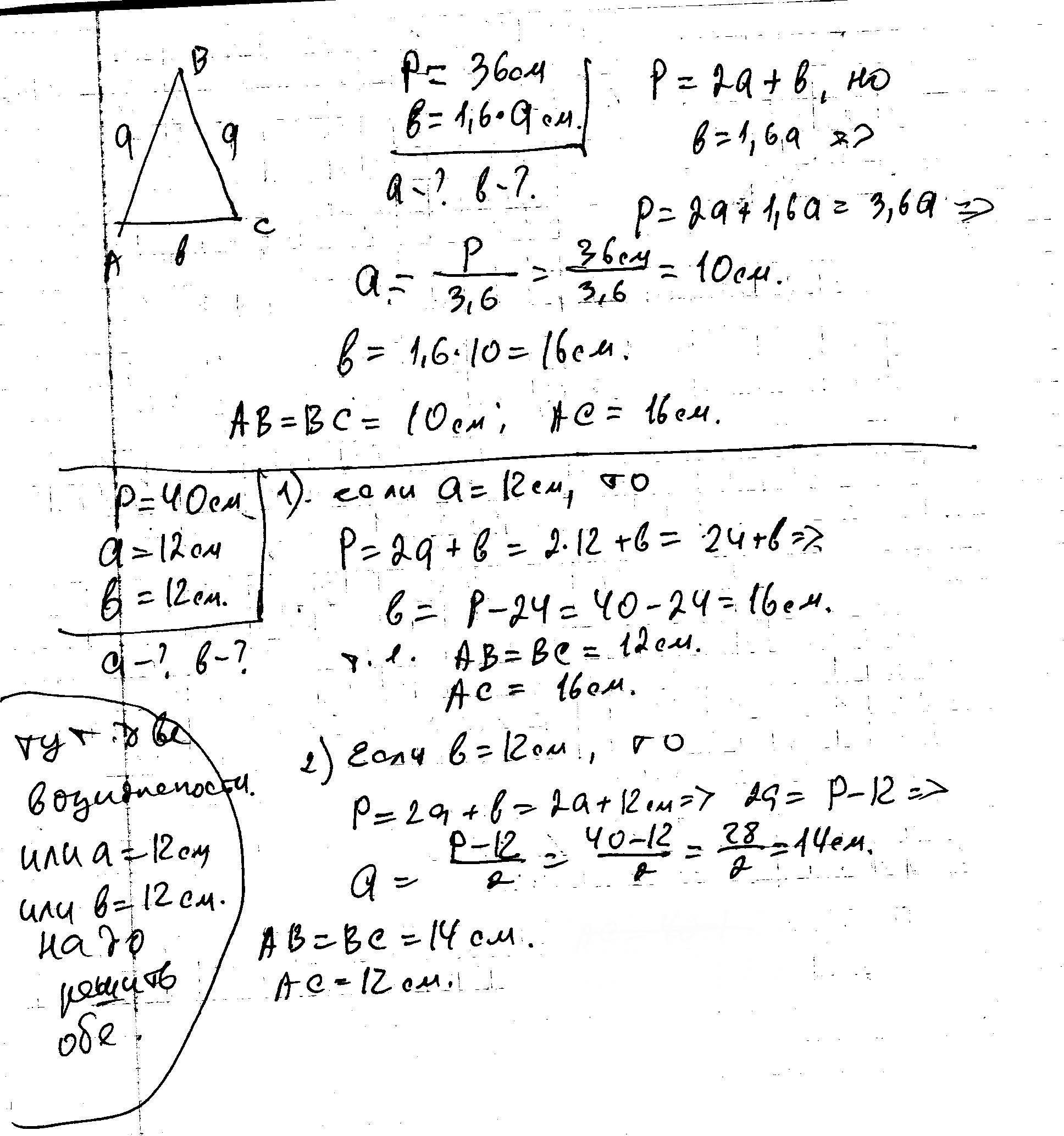 Найдите стороны равнобедренного треугольника, если: а) его периметр равен 36 см и основание составляет 1,6 боковой стороны; б) его периметр равен 40 см, а одна из сторон 12 см.