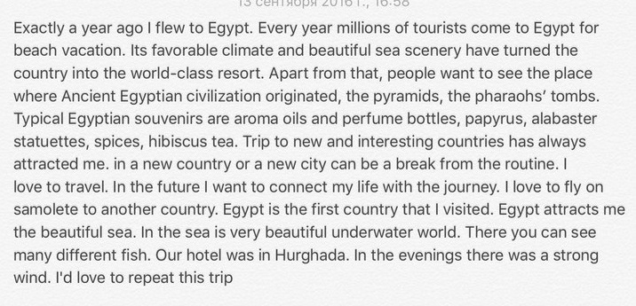 A month I had a wonderful trip to Cyprus. I've never been here. It was perfect. All thibgs were perfect. Beautiful nature, kind people, a warm sea and perfect hotel. Every day we were walking to the beach. It has spent 15 minutes of our time. And sometimes it was too hot to go to the beach in 40degrees above zero. But we have done it. Also we have an exciting excursion. We were in the mountains. We have visited lots of churches and towns. And all of the were so beautiful! Can you imagine? No, unfortunately, you can't. But I can, I remember, remember every second of this travelling. And if I have a chanse to repeat it, I'll do it!