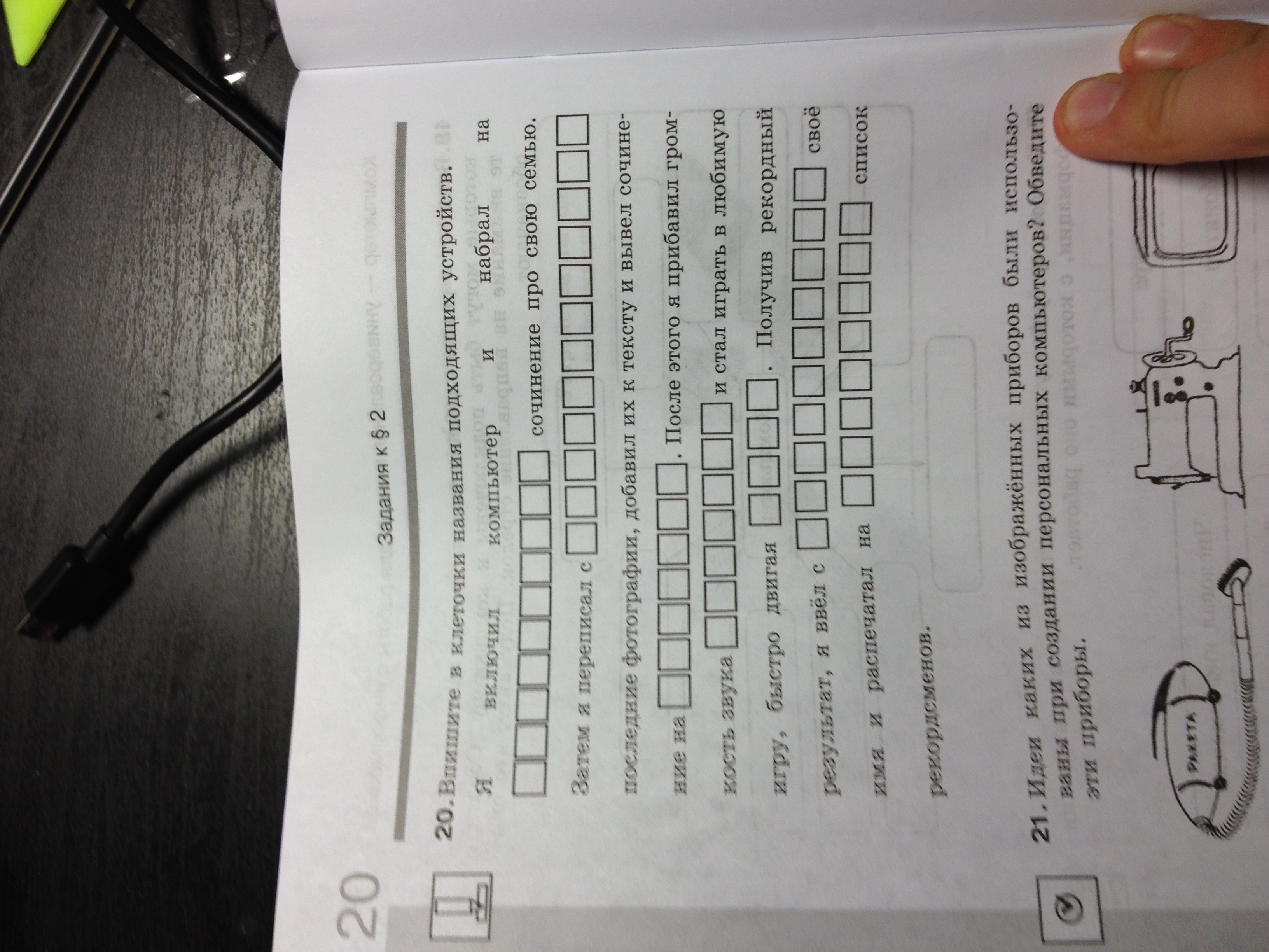 Я включил компьютер и набрал на клавиатуре сочинение про свою семью. Затем я переписал с фотоаппарата последние фотографии, добавил их к тексту и вывел сочинение на монитор. После этого я прибавил громкость звука колонок и стал играть в любимую игру, быстро двигая мышью. Получив рекордный результат, я ввёл с клавиатуры своё имя и распечатал на принтере список рекордсменов.