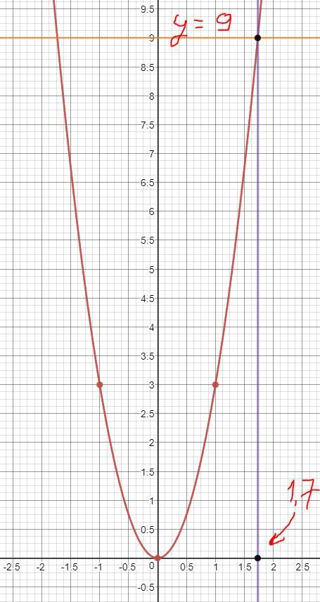 2) Для нахождения значения Х, построим прямую у = 9. Из точки пересечения графика и прямой, с проецируем значение на ось ОХ и найдем по клеточкам приближенное значение с точность до десятых.