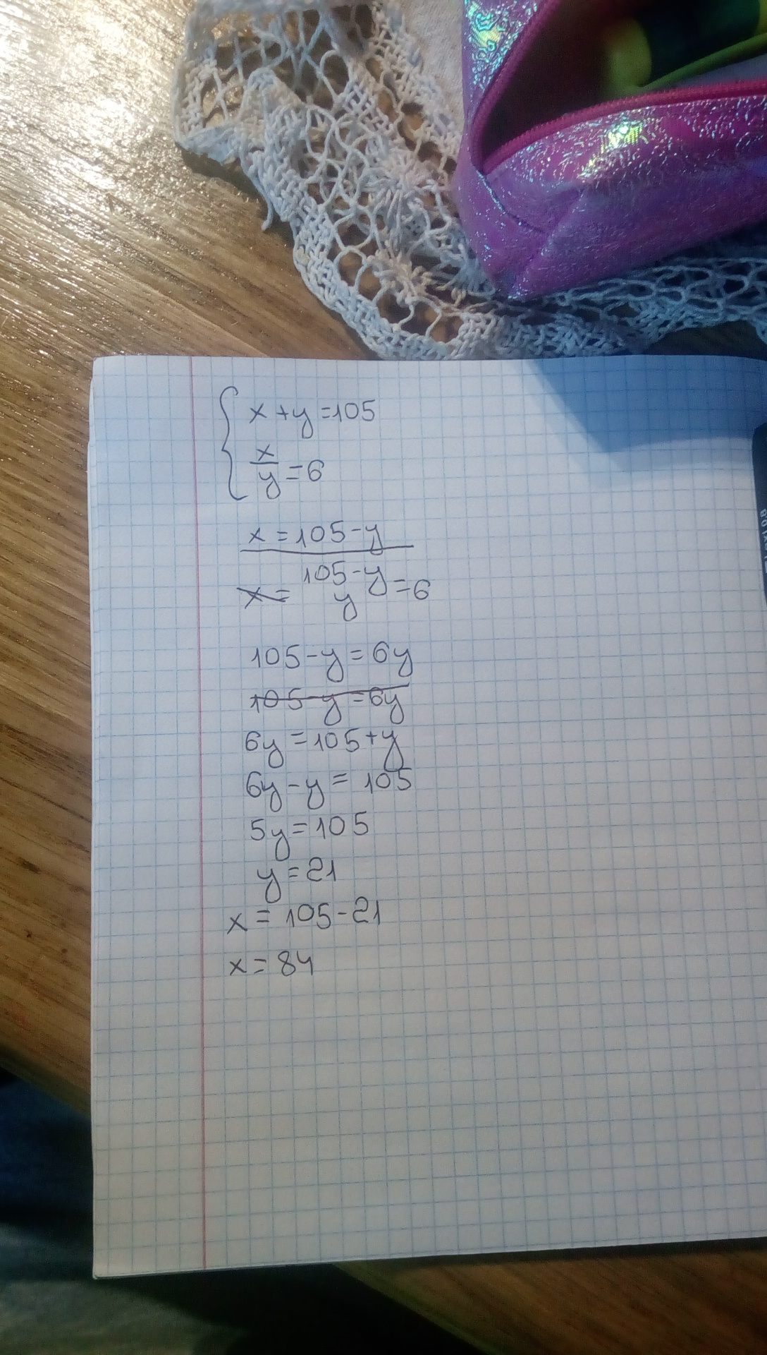 построй математичематическую модель задачи,используя величины x и y: 1)сумма двух чисел равна 105,а их частное равно 6. какие это числа? 2) площадь прямоугольника равна 288 см2, а его периметр-72см. чему равны стороны этого прямоугольника? нарисуйте схему на листе и сфоткайте плиз. буду очень благодарен