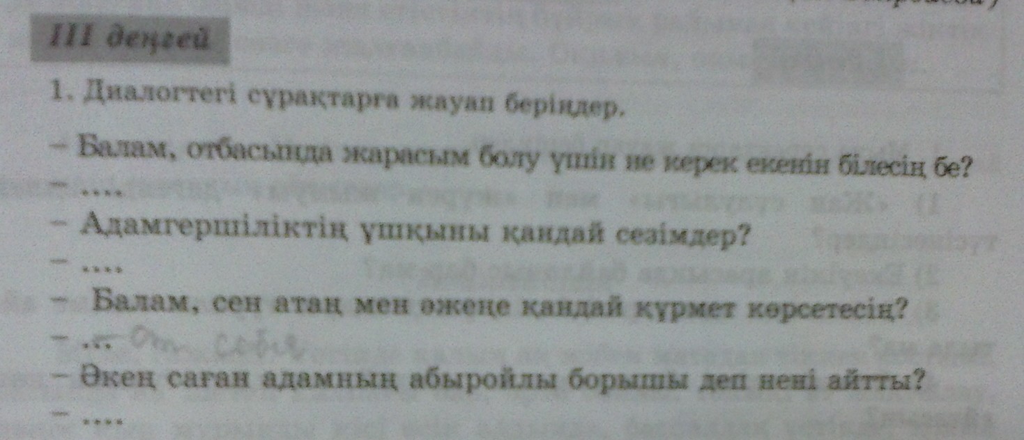 1)сабырлы болу керек. сыйластык пен сену 2) адамды қастерлеу, сыйлау, сену, ар-ұятты сақтау, имандылық пен рахымдылық, ізеттілік пен кішіпейілділік, әділдік, қанағатшылдық, 3)Бұл өмірдегі әр нәрсенің орнын айнытпай түсіндірген ата-әжеме алғысым шексіз. Барлық досыма ата-әжеміздің қадірін білейік, аялайық, ақыл-кеңестерін тыңдап, ақылды болайық дегім келедіренжітпей қуантуға тырысамын.4)адамдық борыш турасында *Ақжолдан айнымай Ар сақта оны біл*- дейді
