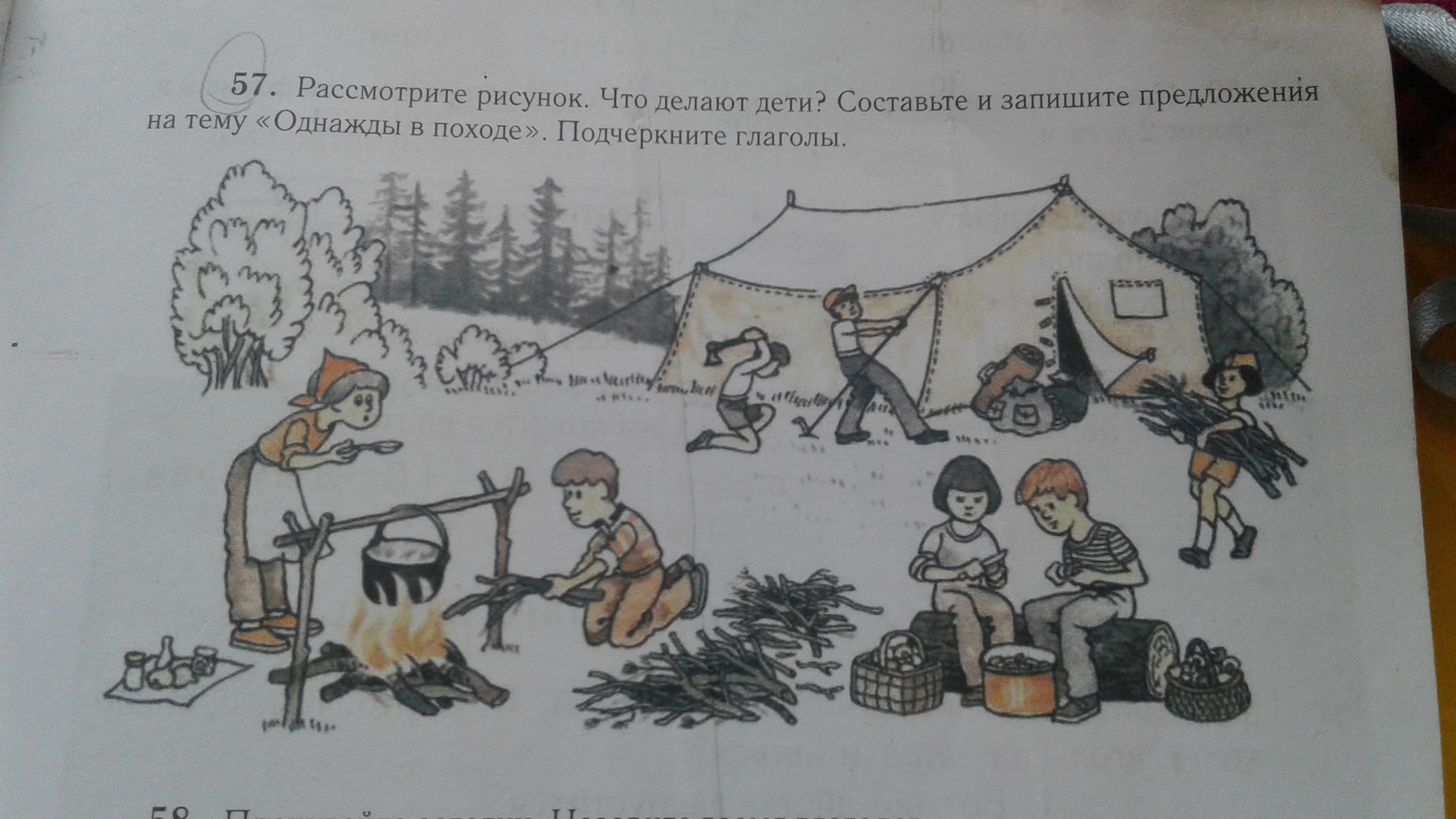 когда я был с классом в походе я и мой друг миша расскладывали поладку коля таскал дрова для костра ольга валерьевна с петровым варили ужин а блезнышки вова и валя чистиль картошку